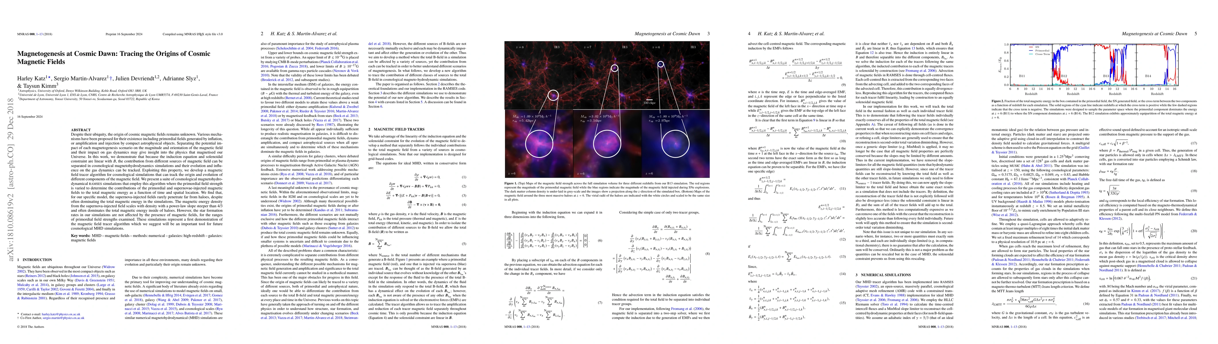 Despite their ubiquity, the origin of cosmic magnetic fields remains unknown. Various mechanisms have been proposed for their existence including primordial fields generated by inflation, or amplification and injection by compact astrophysical objects. Separating the potential impact of each magnetogenesis scenario on the magnitude and orientation of the magnetic field and their impact on gas dynamics may give insight into the physics that magnetised our Universe. In this work, we demonstrate that because the induction equation and solenoidal constraint are linear with $B$, the contribution from different sources of magnetic field can be separated in cosmological magnetohydrodynamics simulations and their evolution and influence on the gas dynamics can be tracked. Exploiting this property, we develop a magnetic field tracer algorithm for cosmological simulations that can track the origin and evolution of different components of the magnetic field. We present a suite of cosmological magnetohydrodynamical RAMSES simulations that employ this algorithm where the primordial field strength is varied to determine the contributions of the primordial and supernovae-injected magnetic fields to the total magnetic energy as a function of time and spatial location. We find that, for our specific model, the supernova-injected fields rarely penetrate far from haloes, despite often dominating the total magnetic energy in the simulations. The magnetic energy density from the supernova-injected field scales with density with a power-law slope steeper than 4/3 and often dominates the total magnetic energy inside of haloes. However, the star formation rates in our simulations are not affected by the presence of magnetic fields, for the ranges of primordial field strengths examined. These simulations represent a first demonstration of the magnetic field tracer algorithm (abridged).