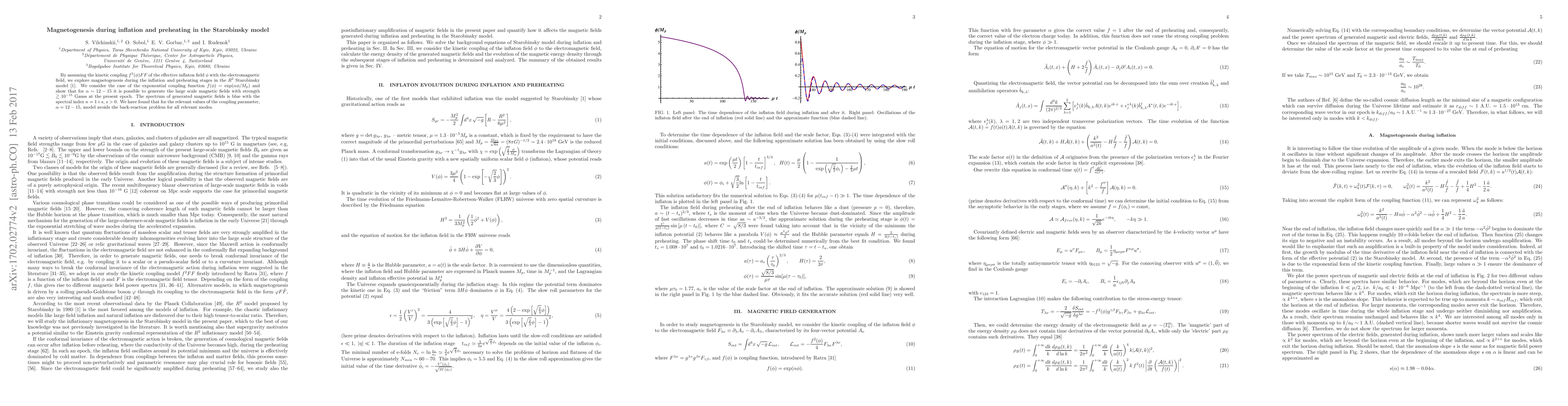 This paper investigates magnetogenesis during inflation and preheating in the Starobinsky model, demonstrating that a kinetic coupling between the inflaton field and the electromagnetic field can generate large-scale magnetic fields of strength $\gtrsim 10^{-15}$ Gauss today, with a blue spectrum. The model avoids the back-reaction problem for coupling parameters $\alpha \sim 12-15$.