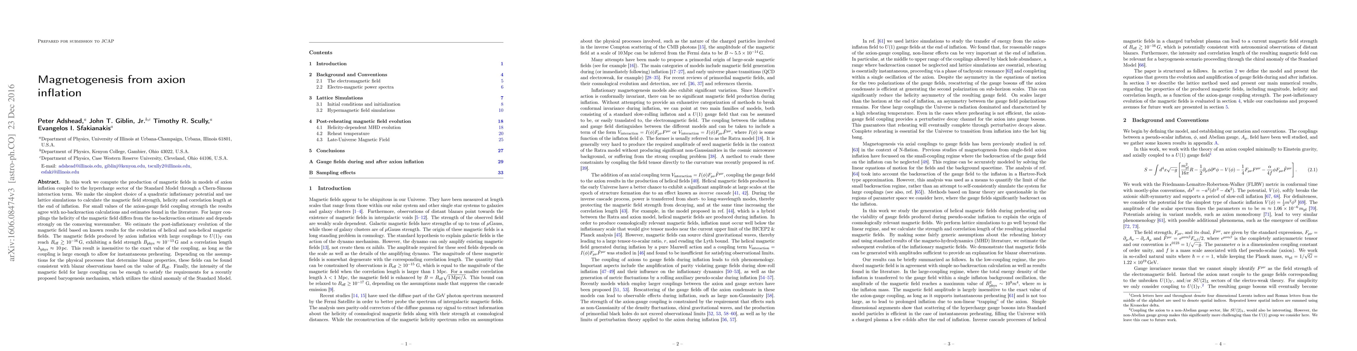 This paper explores the generation of magnetic fields during axion inflation linked to the hypercharge sector via a Chern-Simons interaction. It finds that large axion-gauge field couplings can produce magnetic fields with strengths up to $B_{\rm phys} \approx 10^{-13}\, {\rm G}$, potentially consistent with blazar observations and sufficient for certain baryogenesis mechanisms.