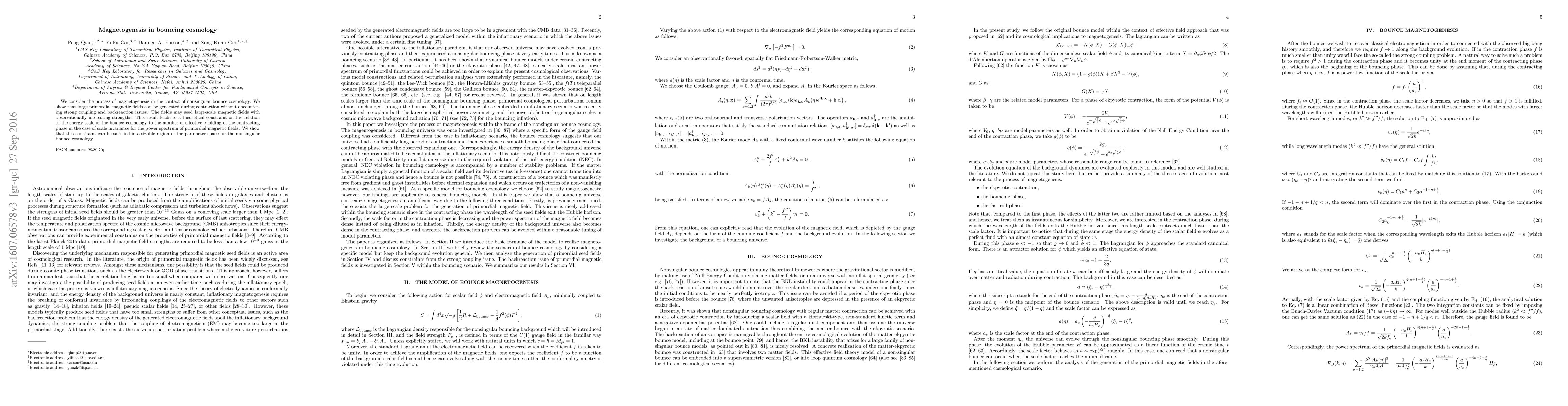This paper explores magnetogenesis in nonsingular bouncing cosmology, demonstrating that large primordial magnetic fields can form during the contraction phase without significant coupling or backreaction issues. The study finds a theoretical constraint linking the energy scale of the bounce to the contracting phase's e-folding number, which can be satisfied within a substantial parameter space of the nonsingular bounce model.