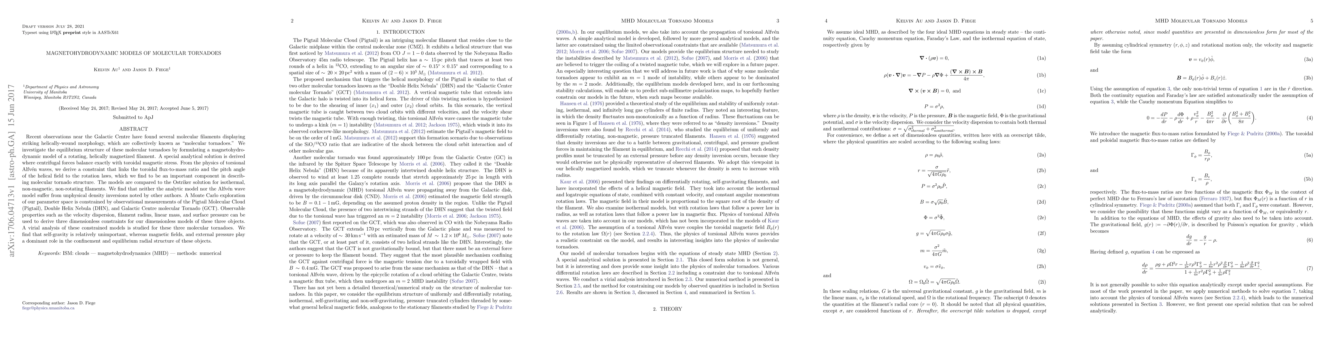 Recent observations near the Galactic Centre have found several molecular filaments displaying striking helically-wound morphology, which are collectively known as "molecular tornadoes." We investigate the equilibrium structure of these molecular tornadoes by formulating a magnetohydrodynamic model of a rotating, helically magnetized filament. A special analytical solution is derived where centrifugal forces balance exactly with toroidal magnetic stress. From the physics of torsional Alfv\'{e}n waves, we derive a constraint that links the toroidal flux-to-mass ratio and the pitch angle of the helical field to the rotation laws, which we find to be an important component in describing molecular tornado structure. The models are compared to the Ostriker solution for isothermal, non-magnetic, non-rotating filaments. We find that neither the analytic model nor the Alfv\'{e}n wave model suffer from unphysical density inversions noted by other authors. A Monte Carlo exploration of our parameter space is constrained by observational measurements of the Pigtail Molecular Cloud (Pigtail), Double Helix Nebula (DHN), and Galactic Centre molecular Tornado (GCT). Observable properties such as the velocity dispersion, filament radius, linear mass, and surface pressure can be used to derive three dimensionless constraints for our dimensionless models of these three objects. A virial analysis of these constrained models is studied for these three molecular tornadoes. We find that self-gravity is relatively unimportant, whereas magnetic fields, and external pressure play a dominant role in the confinement and equilibrium radial structure of these objects.