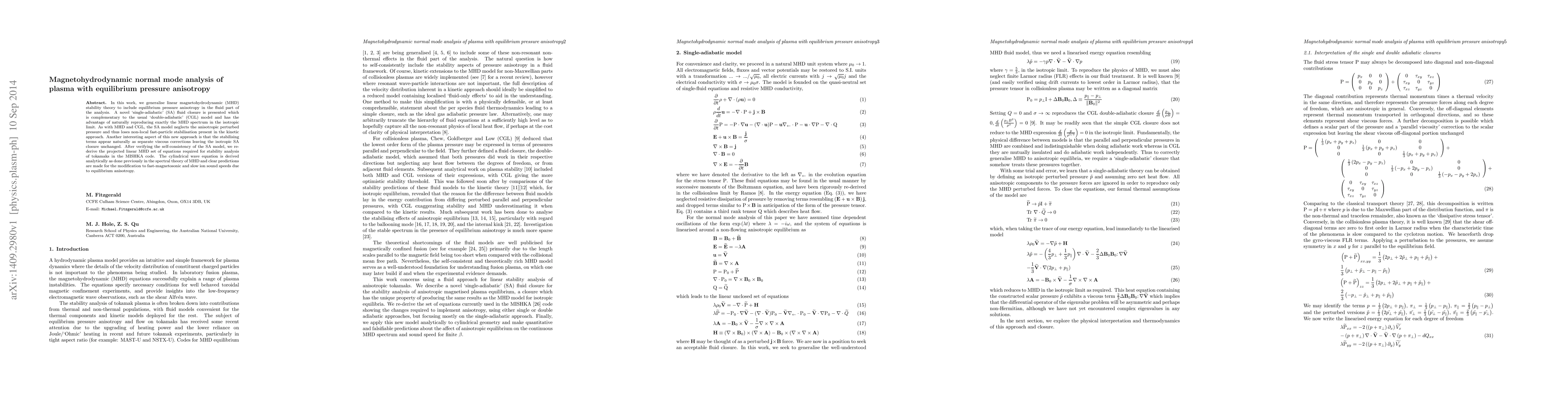 This research generalizes MHD stability theory to include plasma pressure anisotropy, introducing a 'single-adiabatic' fluid model that accurately reduces to MHD in the isotropic limit. The study verifies the model's consistency and re-derives equations for tokamak stability analysis, predicting modifications to fast-magnetosonic and slow ion sound speeds due to equilibrium anisotropy.