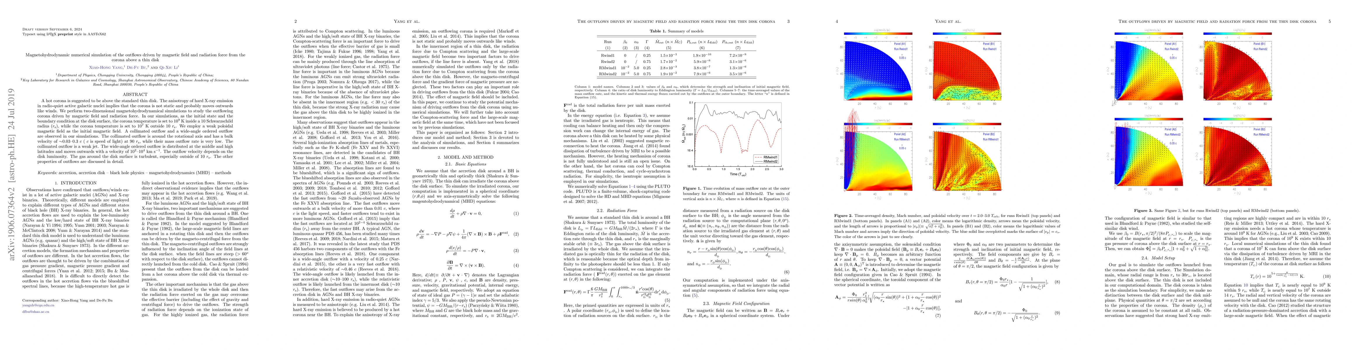 This paper presents two-dimensional magnetohydrodynamic simulations of outflows from the corona above a thin disk, driven by magnetic fields and radiation forces. The study reveals a collimated weak jet along the rotational axis and a wide-angle ordered outflow at higher latitudes, with the latter's velocity dependent on the disk luminosity.