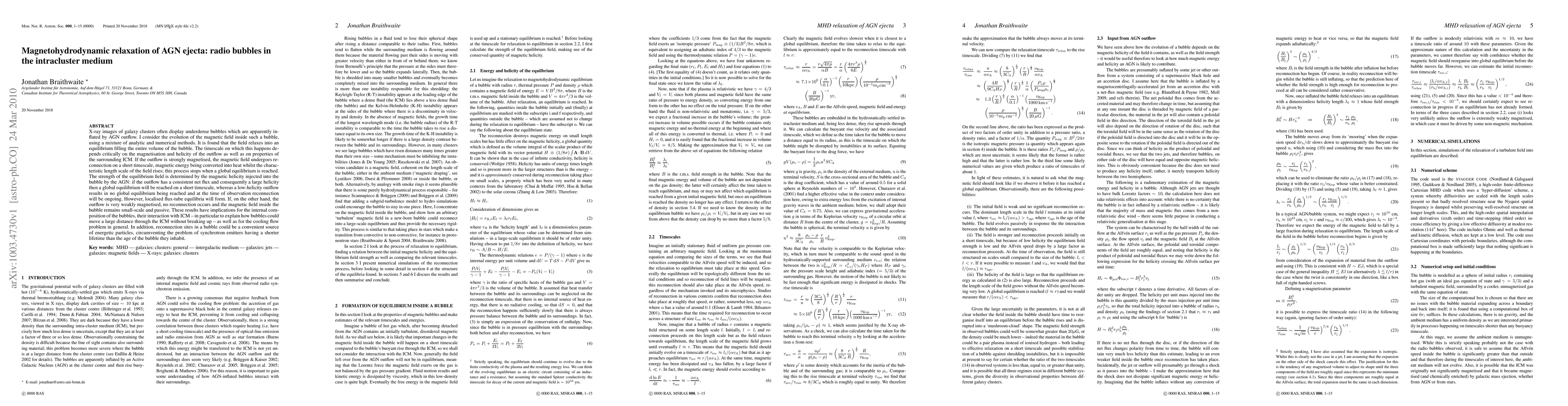 X-ray images of galaxy clusters often display underdense bubbles which are apparently inflated by AGN outflow. I consider the evolution of the magnetic field inside such a bubble, using a mixture of analytic and numerical methods. It is found that the field relaxes into an equilibrium filling the entire volume of the bubble. The timescale on which this happens depends critically on the magnetisation and helicity of the outflow as well as on properties of the surrounding ICM. If the outflow is strongly magnetised, the magnetic field undergoes reconnection on a short timescale, magnetic energy being converted into heat whilst the characteristic length scale of the field rises; this process stops when a global equilibrium is reached. The strength of the equilibrium field is determined by the magnetic helicity injected into the bubble by the AGN: if the outflow has a consistent net flux and consequently a large helicity then a global equilibrium will be reached on a short timescale, whereas a low-helicity outflow results in no global equilibrium being reached and at the time of observation reconnection will be ongoing. However, localised flux-tube equilibria will form. If, on the other hand, the outflow is very weakly magnetised, no reconnection occurs and the magnetic field inside the bubble remains small-scale and passive. These results have implications for the internal composition of the bubbles, their interaction with ICM -- in particular to explain how bubbles could move a large distance through the ICM without breaking up -- as well as for the cooling flow problem in general. In addition, reconnection sites in a bubble could be a convenient source of energetic particles, circumventing the problem of synchrotron emitters having a shorter lifetime than the age of the bubble they inhabit.