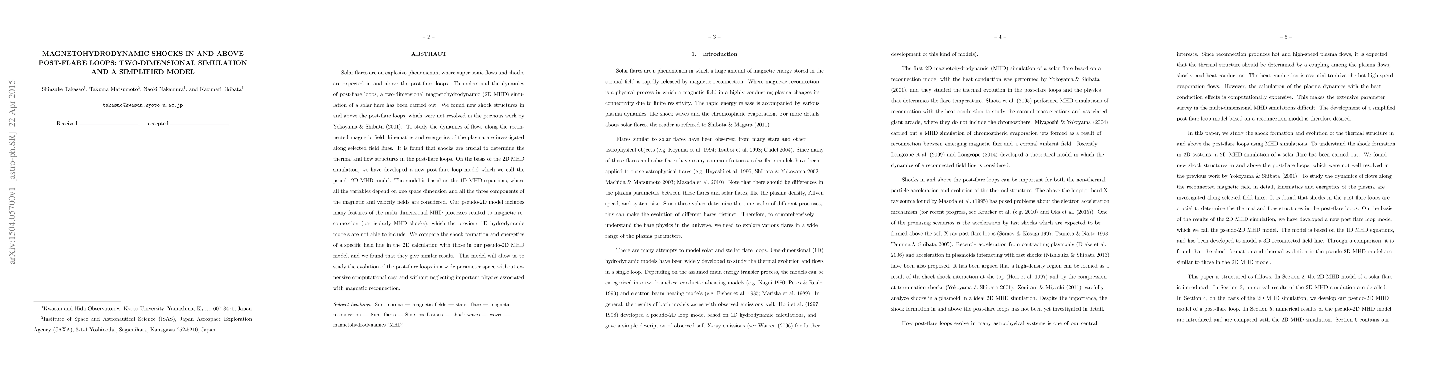 This paper presents a two-dimensional magnetohydrodynamic (2D MHD) simulation of solar flares, revealing new shock structures in post-flare loops. It also introduces a simplified pseudo-2D MHD model that captures the dynamics of magnetic reconnection, providing comparable results to the 2D MHD simulation while reducing computational costs.