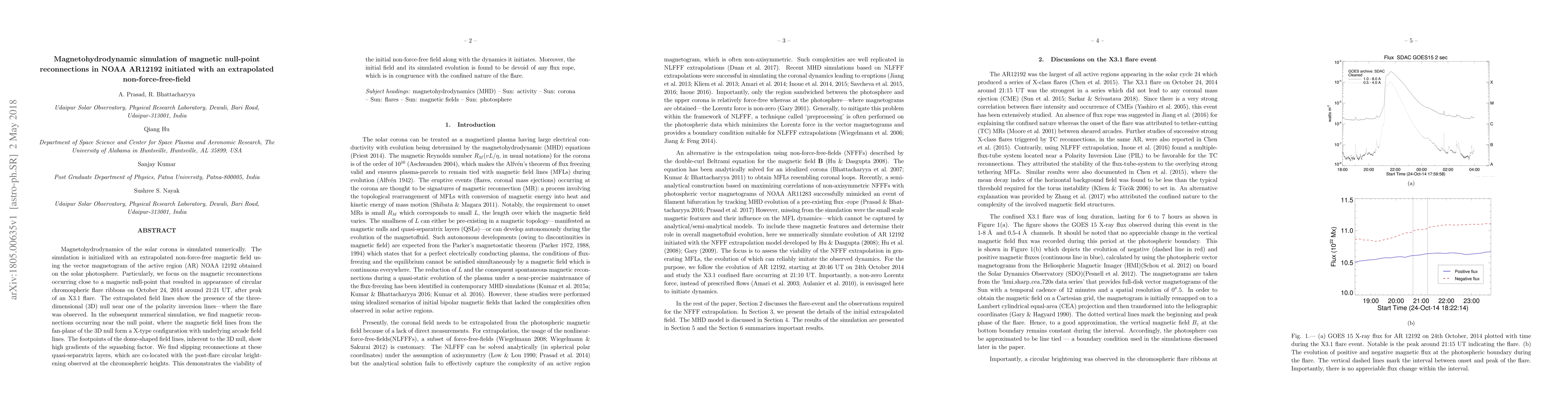 This study simulates magnetohydrodynamic processes in the solar corona, focusing on magnetic reconnections near a null-point in NOAA AR12192, which led to chromospheric flare ribbons. The simulation reveals slipping reconnections in quasi-separatrix layers, correlating with observed post-flare brightening, and confirms the absence of a flux rope, consistent with the confined nature of the flare.