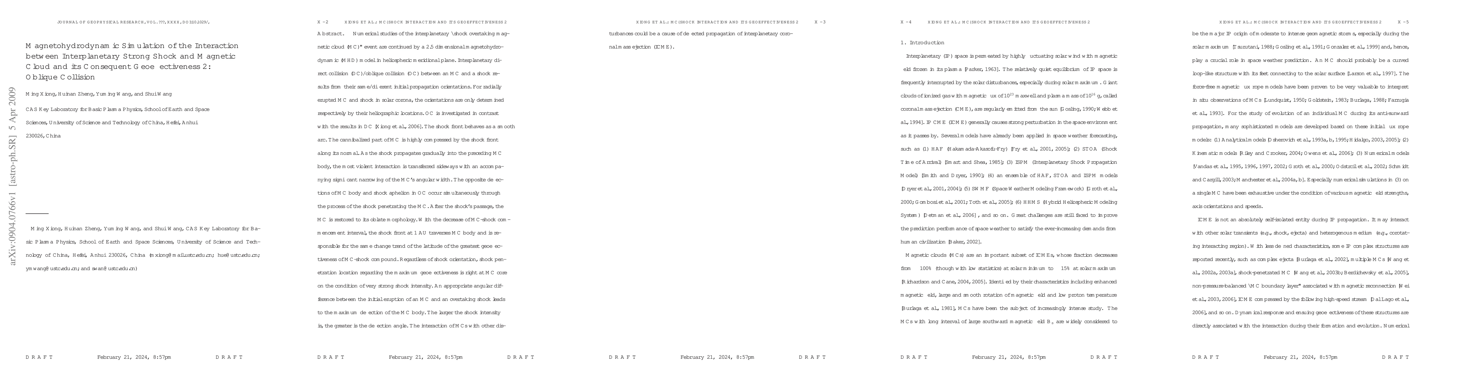 A 2D magnetohydrodynamic model simulates the interaction between an interplanetary strong shock and a magnetic cloud, finding that oblique collisions lead to sideways deflections of the MC body and its greatest geoeffectiveness latitude, with increased intensity leading to larger deflection angles.
