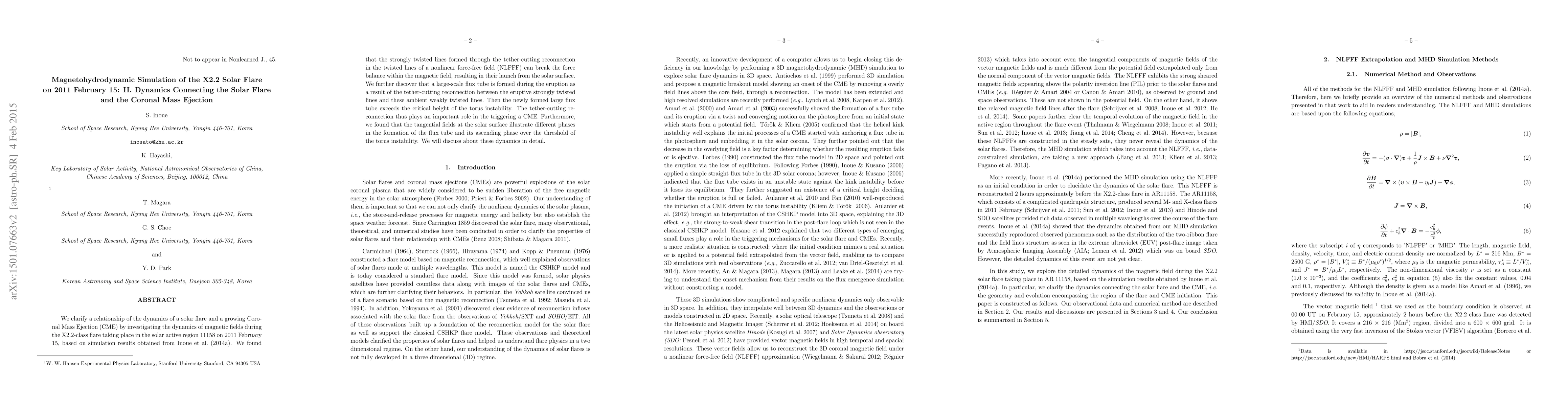 This paper investigates the dynamics linking a solar flare and a coronal mass ejection (CME) using magnetohydrodynamic simulations of the X2.2 flare in 2011. It finds that tether-cutting reconnection of twisted magnetic lines triggers the eruption, leading to the formation of a large flux tube that exceeds the torus instability threshold, thus triggering the CME.