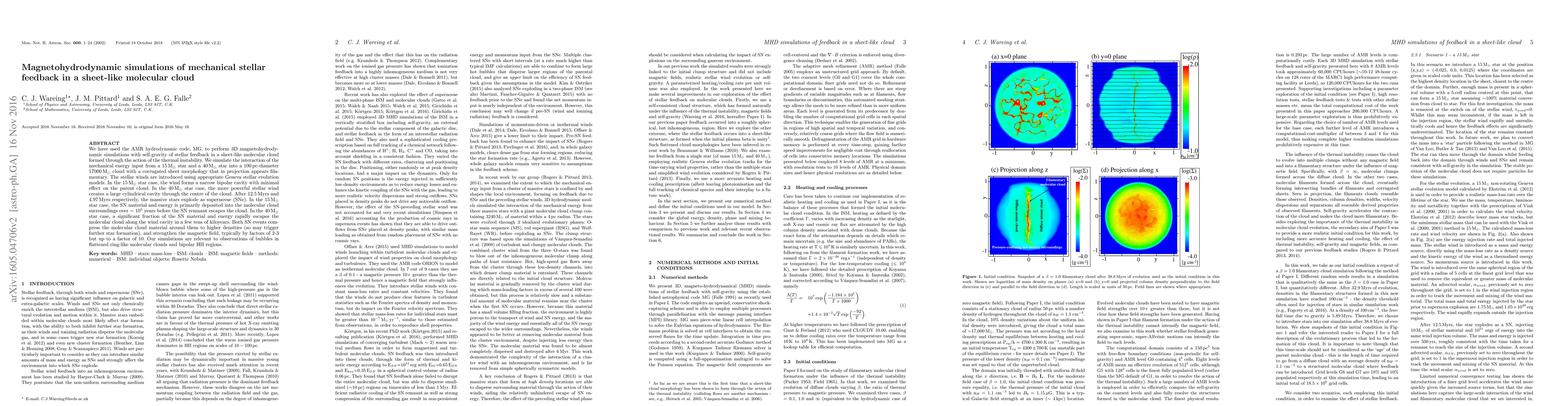 We have used the AMR hydrodynamic code, MG, to perform 3D magnetohydrodynamic simulations with self-gravity of stellar feedback in a sheet-like molecular cloud formed through the action of the thermal instability. We simulate the interaction of the mechanical energy input from a 15 solar mass star and a 40 solar mass star into a 100 pc-diameter 17000 solar mass cloud with a corrugated sheet morphology that in projection appears filamentary. The stellar winds are introduced using appropriate Geneva stellar evolution models. In the 15 solar mass star case, the wind forms a narrow bipolar cavity with minimal effect on the parent cloud. In the 40 solar mass star case, the more powerful stellar wind creates a large cylindrical cavity through the centre of the cloud. After 12.5 Myrs and 4.97 Myrs respectively, the massive stars explode as supernovae (SNe). In the 15 solar mass star case, the SN material and energy is primarily deposited into the molecular cloud surroundings over ~10^5 years before the SN remnant escapes the cloud. In the 40 solar mass star case, a significant fraction of the SN material and energy rapidly escapes the molecular cloud along the wind cavity in a few tens of kiloyears. Both SN events compress the molecular cloud material around them to higher densities (so may trigger further star formation), and strengthen the magnetic field, typically by factors of 2-3 but up to a factor of 10. Our simulations are relevant to observations of bubbles in flattened ring-like molecular clouds and bipolar HII regions.