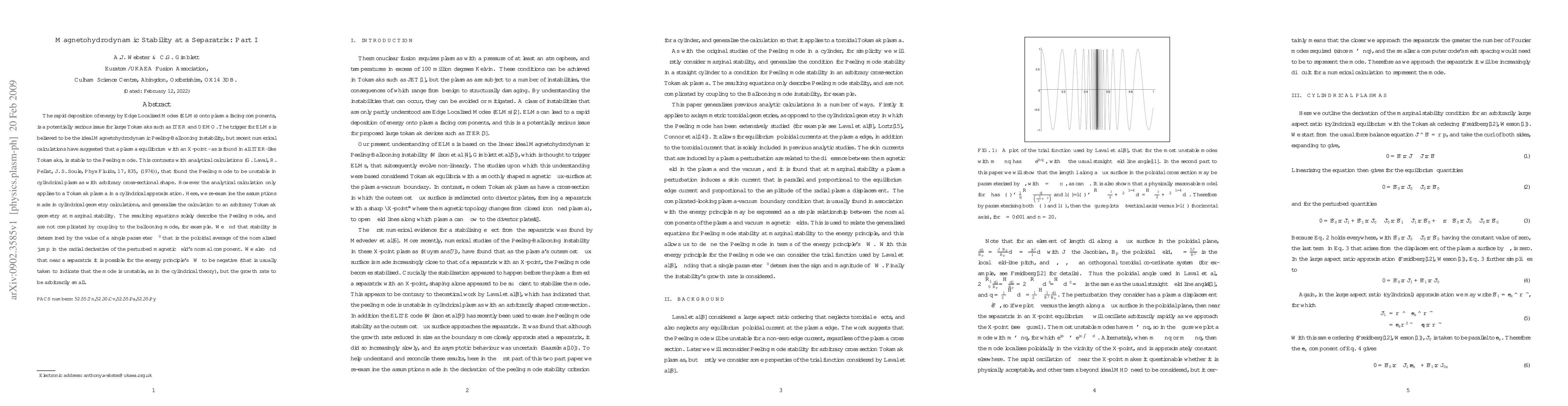The rapid deposition of energy by Edge Localised Modes (ELMs) onto plasma facing components, is a potentially serious issue for large Tokamaks such as ITER and DEMO. The trigger for ELMs is believed to be the ideal Magnetohydrodynamic Peeling-Ballooning instability, but recent numerical calculations have suggested that a plasma equilibrium with an X-point - as is found in all ITER-like Tokamaks, is stable to the Peeling mode. This contrasts with analytical calculations (G. Laval, R. Pellat, J. S. Soule, Phys Fluids, {\bf 17}, 835, (1974)), that found the Peeling mode to be unstable in cylindrical plasmas with arbitrary cross-sectional shape. However the analytical calculation only applies to a Tokamak plasma in a cylindrical approximation. Here, we re-examine the assumptions made in cylindrical geometry calculations, and generalise the calculation to an arbitrary Tokamak geometry at marginal stability. The resulting equations solely describe the Peeling mode, and are not complicated by coupling to the ballooning mode, for example. We find that stability is determined by the value of a single parameter $\Delta'$ that is the poloidal average of the normalised jump in the radial derivative of the perturbed magnetic field's normal component. We also find that near a separatrix it is possible for the energy principle's $\delta W$ to be negative (that is usually taken to indicate that the mode is unstable, as in the cylindrical theory), but the growth rate to be arbitrarily small.