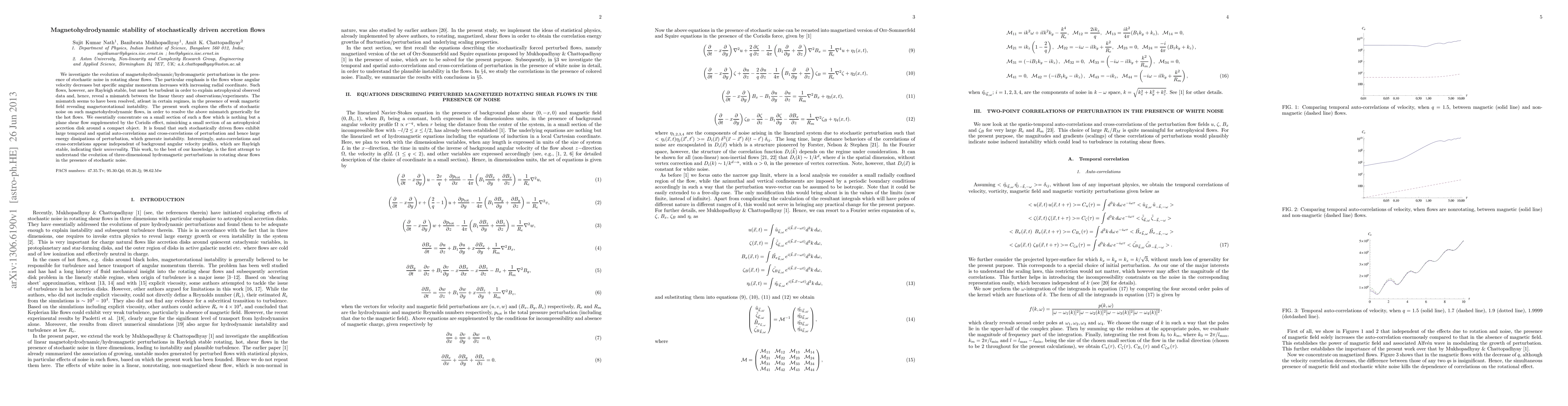 This paper investigates the magnetohydrodynamic stability of accretion flows driven by stochastic noise, focusing on flows with decreasing angular velocity but increasing specific angular momentum. It finds that such flows, though Rayleigh stable, exhibit large temporal and spatial correlations of perturbations, leading to instability and resolving the mismatch between linear theory and astrophysical observations.