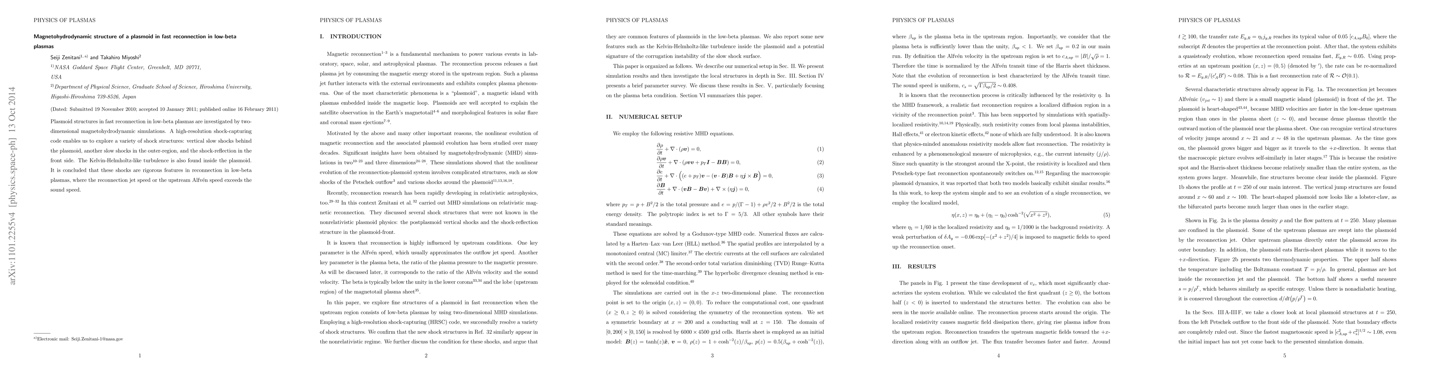 This paper investigates plasmoid structures in fast reconnection within low-beta plasmas using high-resolution magnetohydrodynamic simulations. The study reveals various shock structures and Kelvin-Helmholtz-like turbulence, concluding that these features are significant in reconnection scenarios where jet or Alfven speeds surpass sound speeds.