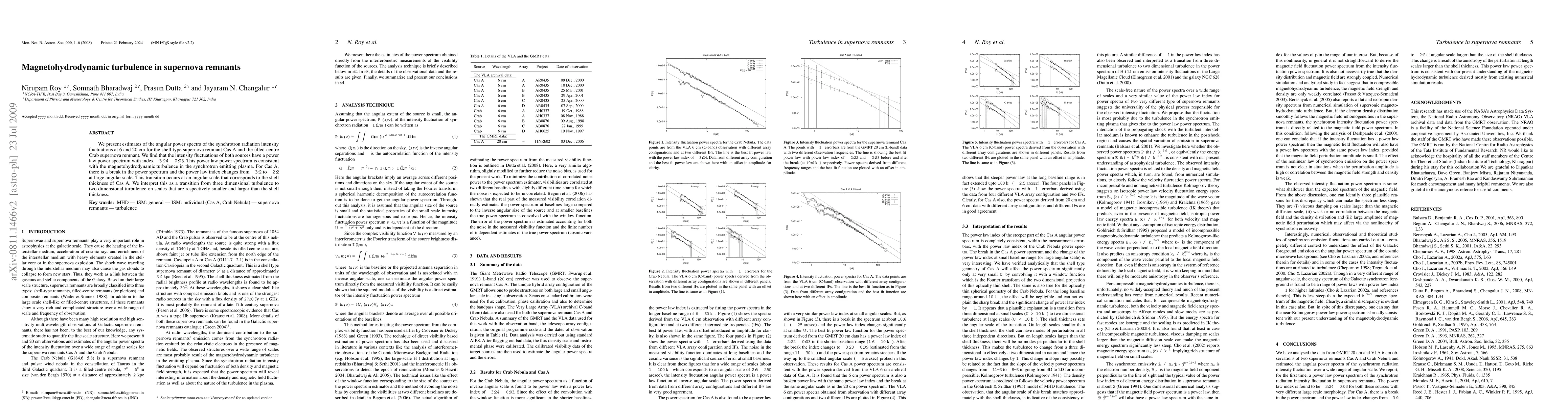 This paper investigates the angular power spectra of synchrotron radiation from supernova remnants Cas A and the Crab, finding a consistent -3.24 power law for intensity fluctuations indicative of magnetohydrodynamic turbulence. For Cas A, a spectral break suggests a transition from three dimensional to two dimensional turbulence at scales comparable to its shell thickness.