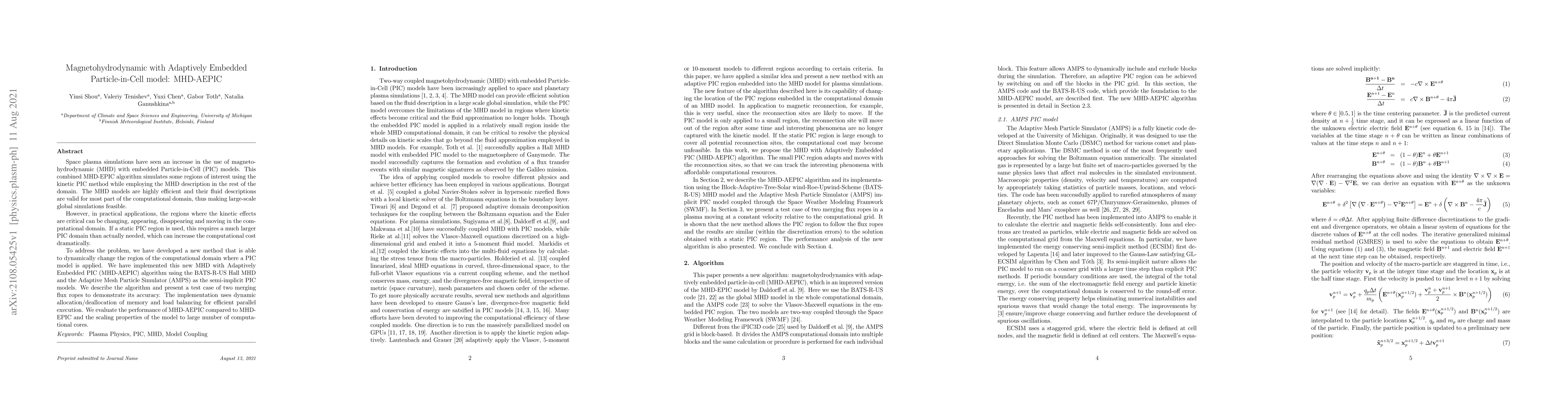 The paper introduces the MHD-AEPIC algorithm, which adaptively embeds Particle-in-Cell (PIC) simulations within magnetohydrodynamic (MHD) models to dynamically adjust to regions requiring kinetic effects. This method optimizes computational efficiency by reducing the static PIC domain size, demonstrating improved performance and scalability in simulations of merging flux ropes.