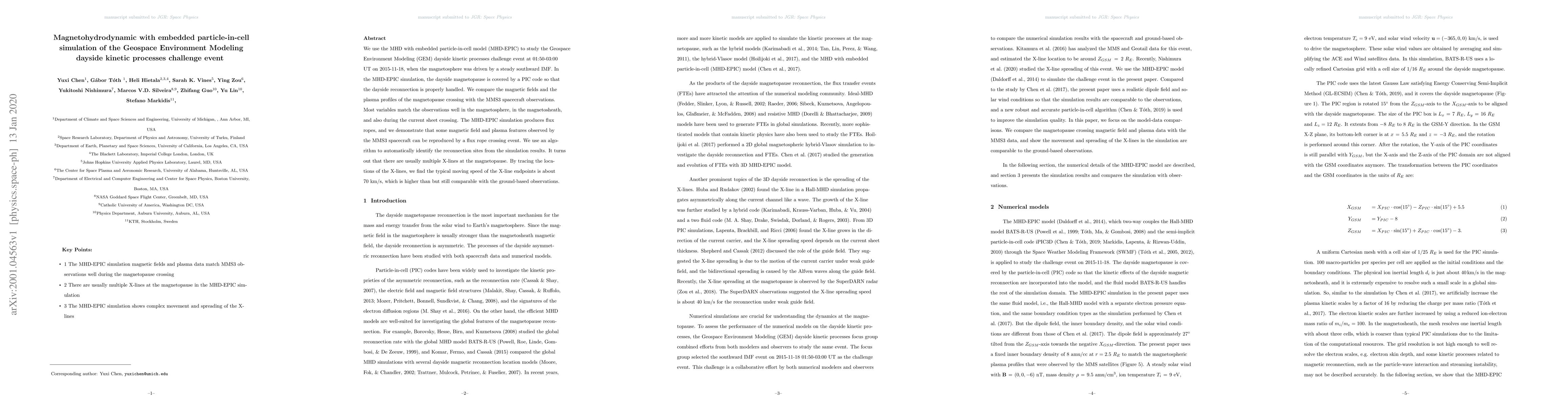 This study employs the MHD with embedded particle-in-cell model (MHD-EPIC) to simulate the GEM dayside kinetic processes challenge event, focusing on the dayside reconnection under a steady southward IMF. The simulation accurately reproduces magnetic fields and plasma profiles observed by MMS3, including flux rope events, and identifies multiple reconnection sites with X-line endpoints moving at approximately 70 km/s.