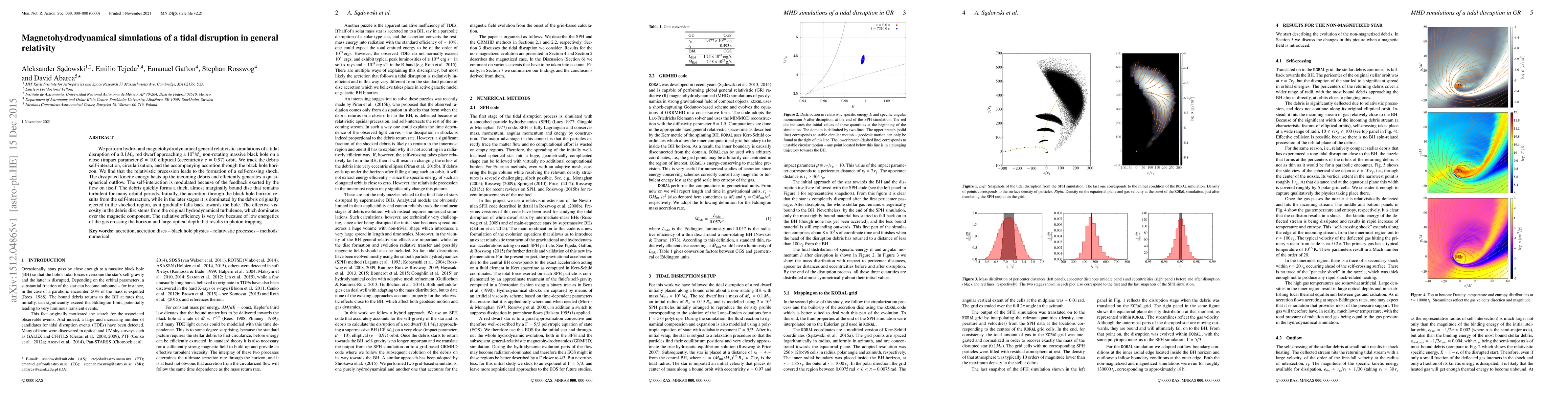We perform hydro- and magnetohydrodynamical general relativistic simulations of a tidal disruption of a $0.1\,M_\odot$ red dwarf approaching a $10^5\,M_\odot$ non-rotating massive black hole on a close (impact parameter $\beta=10$) elliptical (eccentricity $e=0.97$) orbit. We track the debris self-interaction, circularization, and the accompanying accretion through the black hole horizon. We find that the relativistic precession leads to the formation of a self-crossing shock. The dissipated kinetic energy heats up the incoming debris and efficiently generates a quasi-spherical outflow. The self-interaction is modulated because of the feedback exerted by the flow on itself. The debris quickly forms a thick, almost marginally bound disc that remains turbulent for many orbital periods. Initially, the accretion through the black hole horizon results from the self-interaction, while in the later stages it is dominated by the debris originally ejected in the shocked region, as it gradually falls back towards the hole. The effective viscosity in the debris disc stems from the original hydrodynamical turbulence, which dominates over the magnetic component. The radiative efficiency is very low because of low energetics of the gas crossing the horizon and large optical depth that results in photon trapping.