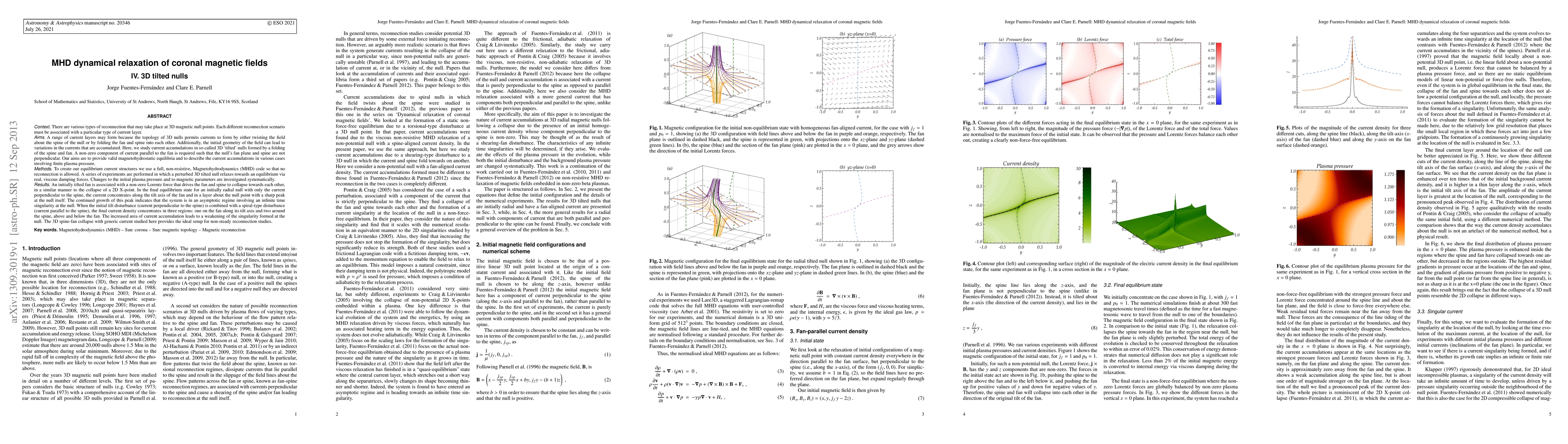 In this paper we study current accumulations in 3D "tilted" nulls formed by a folding of the spine and fan. A non-zero component of current parallel to the fan is required such that the null's fan plane and spine are not perpendicular. Our aims are to provide valid magnetohydrostatic equilibria and to describe the current accumulations in various cases involving finite plasma pressure.To create our equilibrium current structures we use a full, non-resistive, magnetohydrodynamic (MHD) code so that no reconnection is allowed. A series of experiments are performed in which a perturbed 3D tilted null relaxes towards an equilibrium via real, viscous damping forces. Changes to the initial plasma pressure and to magnetic parameters are investigated systematically.An initially tilted fan is associated with a non-zero Lorentz force that drives the fan and spine to collapse towards each other, in a similar manner to the collapse of a 2D X-point. In the final equilibrium state for an initially radial null with only the current perpendicular to the spine, the current concentrates along the tilt axis of the fan and in a layer about the null point with a sharp peak at the null itself. The continued growth of this peak indicates that the system is in an asymptotic regime involving an infinite time singularity at the null. When the initial tilt disturbance (current perpendicular to the spine) is combined with a spiral-type disturbance (current parallel to the spine), the final current density concentrates in three regions: one on the fan along its tilt axis and two around the spine, above and below the fan. The increased area of current accumulation leads to a weakening of the singularity formed at the null. The 3D spine-fan collapse with generic current studied here provides the ideal setup for non-steady reconnection studies.