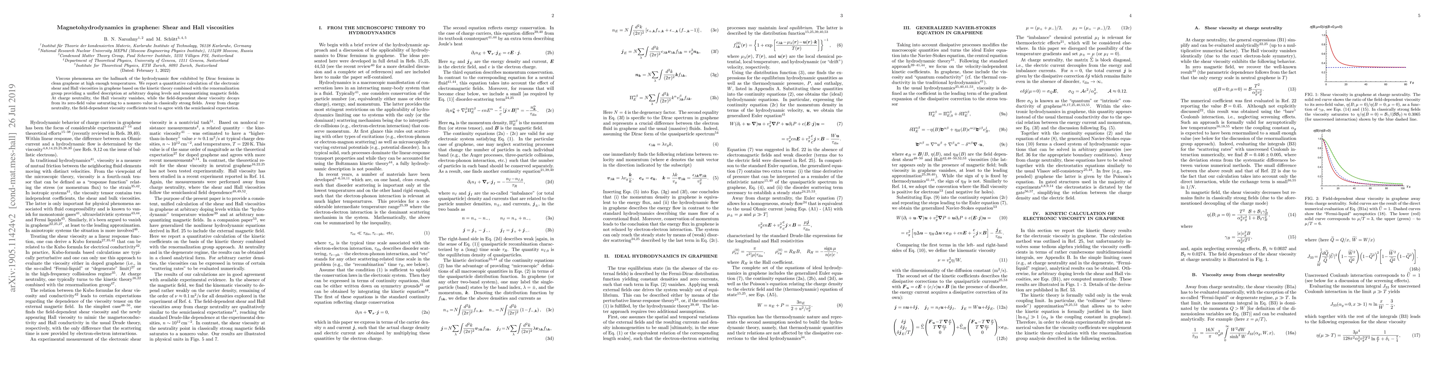 This paper quantitatively calculates the electronic shear and Hall viscosities in graphene using kinetic theory and renormalization group methods. It finds that at charge neutrality, Hall viscosity vanishes, while shear viscosity diminishes in strong fields but saturates at a nonzero value. Away from neutrality, calculated viscosities align with semiclassical predictions.
