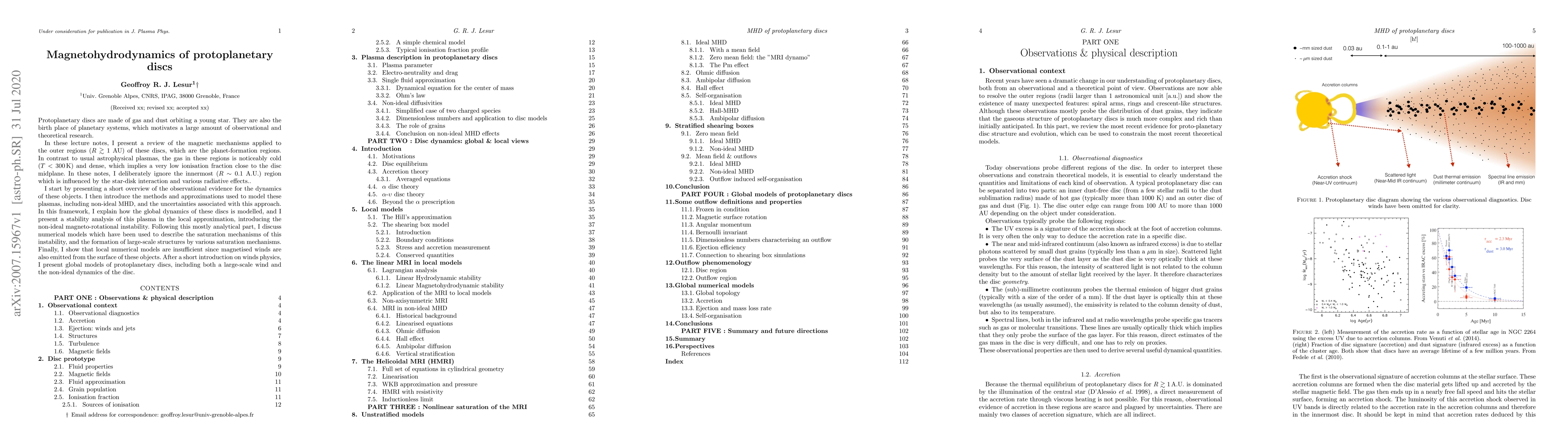 Protoplanetary discs are made of gas and dust orbiting a young star. They are also the birth place of planetary systems, which motivates a large amount of observational and theoretical research. In these lecture notes, I present a review of the magnetic mechanisms applied to the outer regions R>1 AU of these discs, which are the planet-formation regions. In contrast to usual astrophysical plasmas, the gas in these regions is noticeably cold (T<300 K) and dense, which implies a very low ionisation fraction close to the disc midplane. In these notes, I deliberately ignore the innermost R~0.1 AU region which is influenced by the star-disk interaction and various radiative effects. I start by presenting a short overview of the observational evidence for the dynamics of these objects. I then introduce the methods and approximations used to model these plasmas, including non-ideal MHD, and the uncertainties associated with this approach. In this framework, I explain how the global dynamics of these discs is modelled, and I present a stability analysis of this plasma in the local approximation, introducing the non-ideal magneto-rotational instability. Following this mostly analytical part, I discuss numerical models which have been used to describe the saturation mechanisms of this instability, and the formation of large-scale structures by various saturation mechanisms. Finally, I show that local numerical models are insufficient since magnetised winds are also emitted from the surface of these objects. After a short introduction on winds physics, I present global models of protoplanetary discs, including both a large-scale wind and the non-ideal dynamics of the disc.