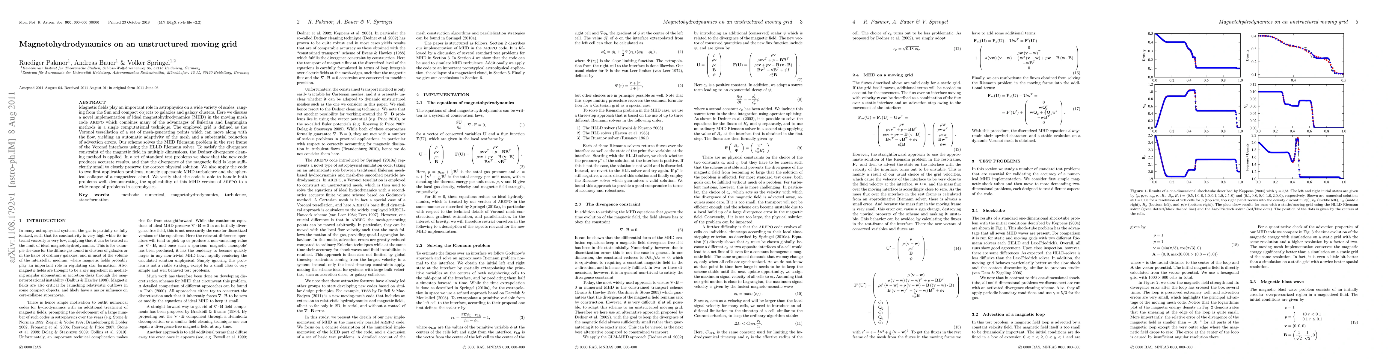 Magnetic fields play an important role in astrophysics on a wide variety of scales, ranging from the Sun and compact objects to galaxies and galaxy clusters. Here we discuss a novel implementation of ideal magnetohydrodynamics (MHD) in the moving mesh code AREPO which combines many of the advantages of Eulerian and Lagrangian methods in a single computational technique. The employed grid is defined as the Voronoi tessellation of a set of mesh-generating points which can move along with the flow, yielding an automatic adaptivity of the mesh and a substantial reduction of advection errors. Our scheme solves the MHD Riemann problem in the rest frame of the Voronoi interfaces using the HLLD Riemann solver. To satisfy the divergence constraint of the magnetic field in multiple dimensions, the Dedner divergence cleaning method is applied. In a set of standard test problems we show that the new code produces accurate results, and that the divergence of the magnetic field is kept sufficiently small to closely preserve the correct physical solution. We also apply the code to two first application problems, namely supersonic MHD turbulence and the spherical collapse of a magnetized cloud. We verify that the code is able to handle both problems well, demonstrating the applicability of this MHD version of AREPO to a wide range of problems in astrophysics.
