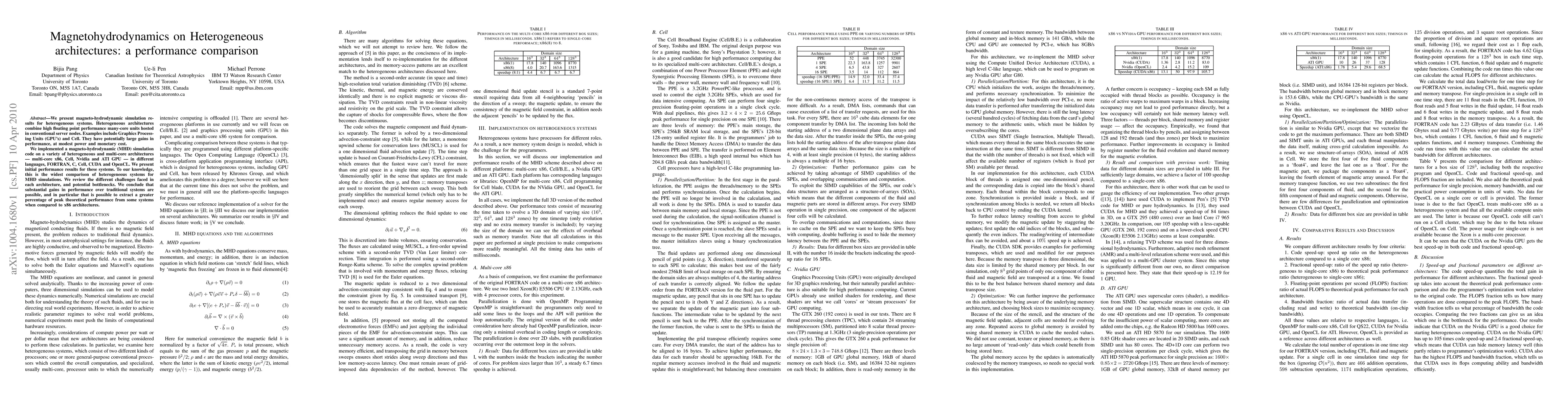 This paper presents a comparative analysis of magnetohydrodynamic (MHD) simulations on various heterogeneous architectures, including multi-core x86, Cell, and GPUs. The study highlights significant performance gains and potential bottlenecks, concluding that certain heterogeneous systems can achieve higher percentages of peak performance compared to traditional x86 architectures.