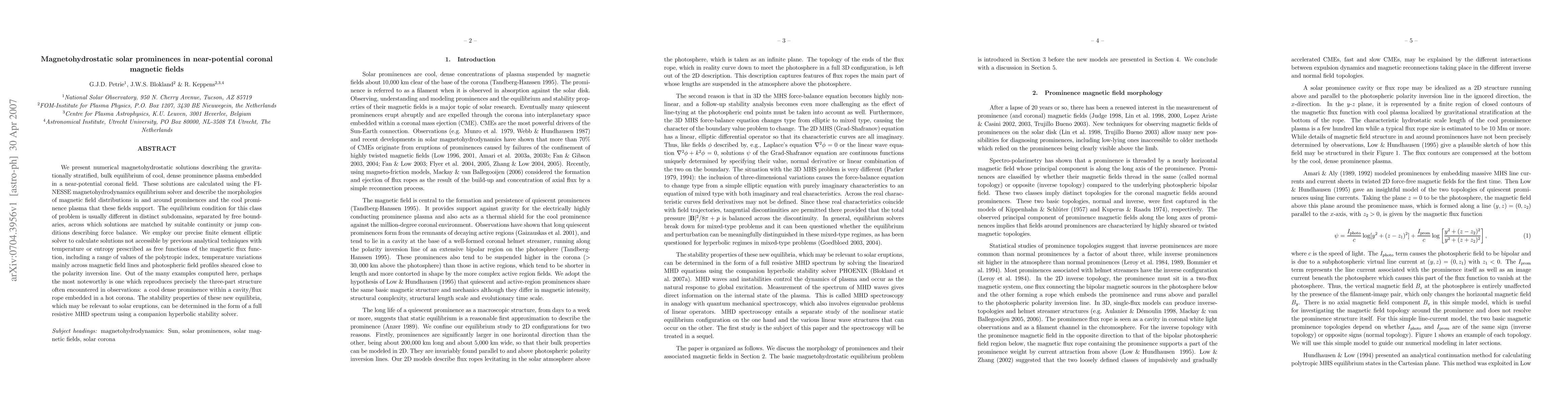 We present numerical magnetohydrostatic solutions describing the gravitationally stratified, bulk equilibrium of cool, dense prominence plasma embedded in a near-potential coronal field. These solutions are calculated using the FINESSE magnetohydrodynamics equilibrium solver and describe the morphologies of magnetic field distributions in and around prominences and the cool prominence plasma that these fields support. The equilibrium condition for this class of problem is usually different in distinct subdomains, separated by free boundaries, across which solutions are matched by suitable continuity or jump conditions describing force balance. We employ our precise finite element elliptic solver to calculate solutions not accessible by previous analytical techniques with temperature or entropy prescribed as free functions of the magnetic flux function, including a range of values of the polytropic index, temperature variations mainly across magnetic field lines and photospheric field profiles sheared close to the polarity inversion line. Out of the many examples computed here, perhaps the most noteworthy is one which reproduces precisely the three-part structure often encountered in observations: a cool dense prominence within a cavity/flux rope embedded in a hot corona. The stability properties of these new equilibria, which may be relevant to solar eruptions, can be determined in the form of a full resistive MHD spectrum using a companion hyperbolic stability solver.