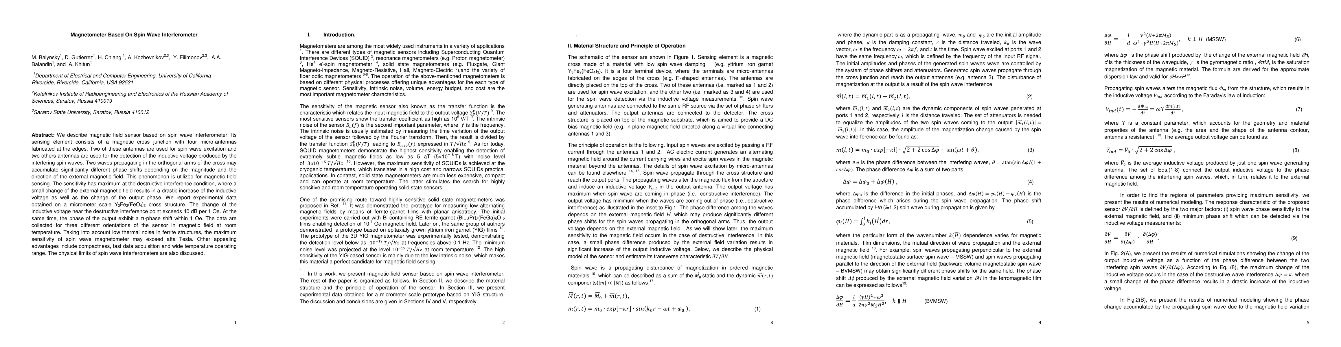 We describe magnetic field sensor based on spin wave interferometer. Its sensing element consists of a magnetic cross junction with four micro-antennas fabricated at the edges. Two of these antennas are used for spin wave excitation and two others antennas are used for the detection of the inductive voltage produced by the interfering spin waves. Two waves propagating in the orthogonal arms of the cross may accumulate significantly different phase shifts depending on the magnitude and the direction of the external magnetic field. This phenomenon is utilized for magnetic field sensing. The sensitivity has maximum at the destructive interference condition, where a small change of the external magnetic field results in a drastic increase of the inductive voltage as well as the change of the output phase. We report experimental data obtained on a micrometer scale Y3Fe2(FeO4)3 cross structure. The change of the inductive voltage near the destructive interference point exceeds 40 dB per 1 Oe. At the same time, the phase of the output exhibit a {\pi}-phase shift within 1 Oe. The data are collected for three different orientations of the sensor in magnetic field at room temperature. Taking into account low thermal noise in ferrite structures, the maximum sensitivity of spin wave magnetometer may exceed atta Tesla. Other appealing advantages include compactness, fast data acquisition and wide temperature operating range. The physical limits of spin wave interferometers are also discussed.