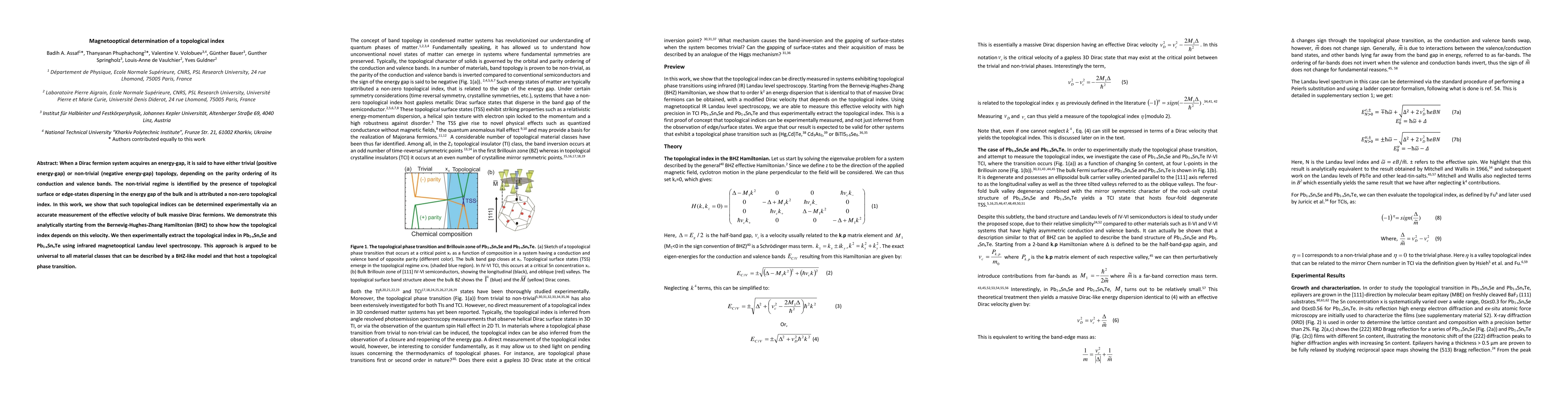 When a Dirac fermion system acquires an energy-gap, it is said to have either trivial (positive energy-gap) or non-trivial (negative energy-gap) topology, depending on the parity ordering of its conduction and valence bands. The non-trivial regime is identified by the presence of topological surface or edge-state dispersing in the energy gap of the bulk and is attributed a non-zero topological index. In this work, we show that such topological indices can be determined experimentally via an accurate measurement of the effective velocity of bulk massive Dirac fermions. We demonstrate this analytically starting from the Bernevig-Hughes-Zhang Hamiltonian (BHZ) to show how the topological index depends on this velocity. We then experimentally extract the topological index in Pb1-xSnxSe and Pb1-xSnxTe using infrared magnetooptical Landau level spectroscopy. This approach is argued to be universal to all material classes that can be described by a BHZ-like model and that host a topological phase transition.