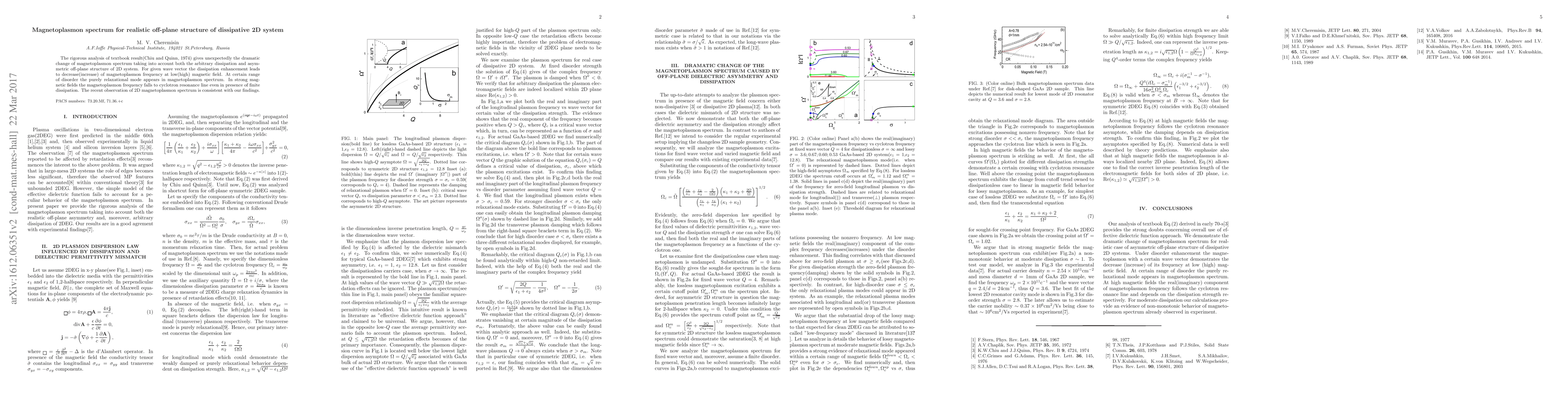 The rigorous analysis of textbook result(Chiu and Quinn, 1974) gives unexpectedly the dramatic change of magnetoplasmon spectrum taking into account both the arbitrary dissipation and asymmetric off-plane structure of 2D system. For given wave vector the dissipation enhancement leads to decrease(increase) of magnetoplasmon frequency at low(high) magnetic field. At certain range of disorder the purely relaxational mode appears in magnetoplasmon spectrum. In strong magnetic fields the magnetoplasmon frequency falls to cyclotron resonance line even in presence of finite dissipation. The recent observation of 2D magnetoplasmon spectrum is consistent with our findings.