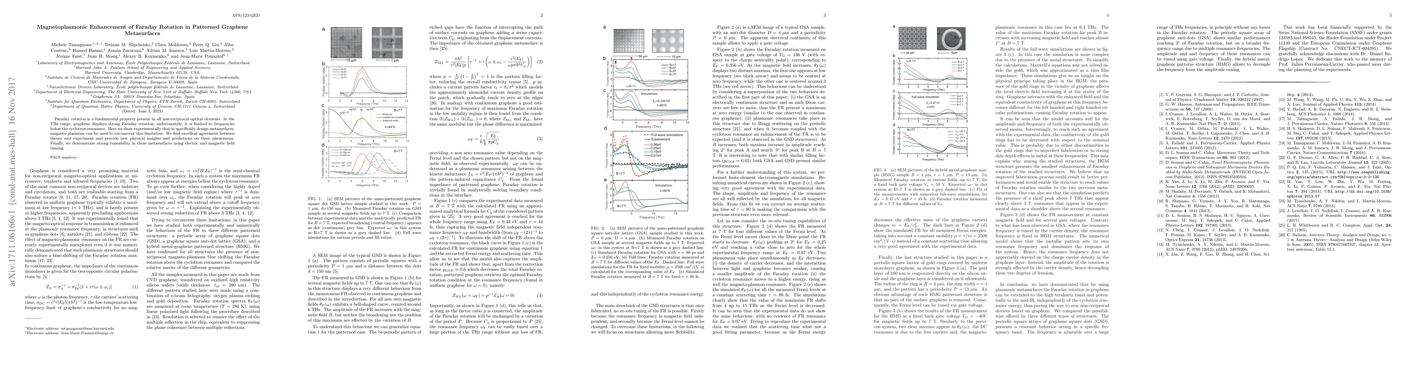 This research demonstrates that patterned graphene metasurfaces enhanced with magneto-plasmons significantly boost Faraday rotation in the THz range, overcoming limitations at frequencies below cyclotron resonance, and showcase strong tunability through electric and magnetic field adjustments. Theoretical and experimental results align well, providing new insights into these phenomena.