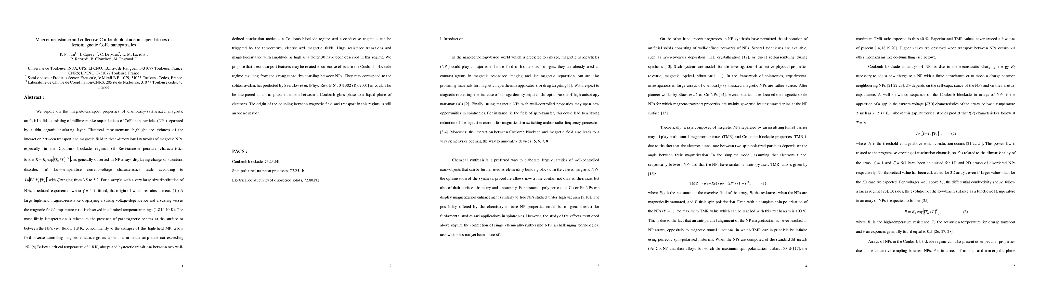 We report on transport properties of millimetric super-lattices of CoFe nanoparticles surrounded by organic ligands. R(T)s follow R(T) = R_0.exp(T/T_0)^0.5 with T_0 ranging from 13 to 256 K. At low temperature I(V)s follow I=K[(V-V_T)/V_T]^ksi with ksi ranging 3.5 to 5.2. I(V) superpose on a universal curve when shifted by a voltage proportional to the temperature. Between 1.8 and 10 K a high-field magnetoresistance with large amplitude and a strong voltage-dependence is observed. Its amplitude only depends on the magnetic field/temperature ratio. Its origin is attributed to the presence of paramagnetic states present at the surface or between the nanoparticles. Below 1.8 K, this high-field magnetoresistance abruptly disappears and inverse tunnelling magnetoresistance is observed, the amplitude of which does not exceed 1%. At this low temperature, some samples display in their I(V) characteristics abrupt and hysteretic transitions between the Coulomb blockade regime and the conductive regime. The increase of the current during these transitions can be as high as a factor 30. The electrical noise increases when the sample is near the transition. The application of a magnetic field decreases the voltage at which these transitions occur so magnetic-field induced transitions are also observed. Depending on the applied voltage, the temperature and the amplitude of the magnetic field, the magnetic-field induced transitions are either reversible or irreversible. These abrupt and hysteretic transitions are also observed in resistance-temperature measurements. They could be the soliton avalanches predicted by Sverdlov et al. [Phys. Rev. B 64, 041302 (R), 2001] or could also be interpreted as a true phase transition between a Coulomb glass phase to a liquid phase of electrons.