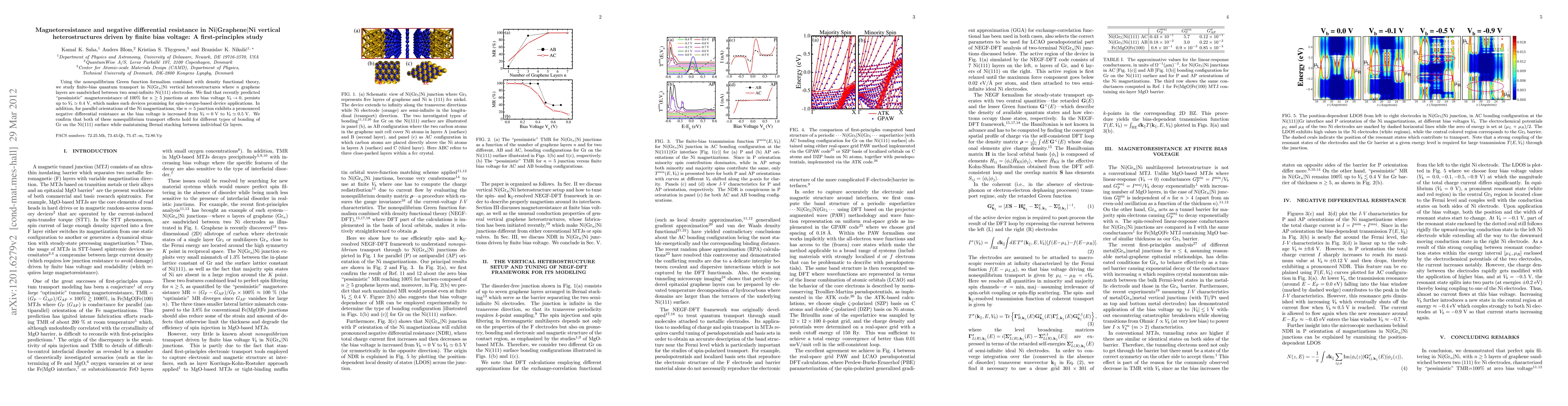 Using the nonequilibrium Green function formalism combined with density functional theory, we study finite-bias quantum transport in Ni/Gr_n/Ni vertical heterostructures where $n$ graphene layers are sandwiched between two semi-infinite Ni(111) electrodes. We find that recently predicted "pessimistic" magnetoresistance of 100% for $n \ge 5$ junctions at zero bias voltage $V_b \rightarrow 0$, persists up to $V_b \simeq 0.4$ V, which makes such devices promising for spin-torque-based device applications. In addition, for parallel orientations of the Ni magnetizations, the $n=5$ junction exhibits a pronounced negative differential resistance as the bias voltage is increased from $V_b=0$ V to $V_b \simeq 0.5$ V. We confirm that both of these nonequilibrium effects hold for different types of bonding of Gr on the Ni(111) surface while maintaining Bernal stacking between individual Gr layers.