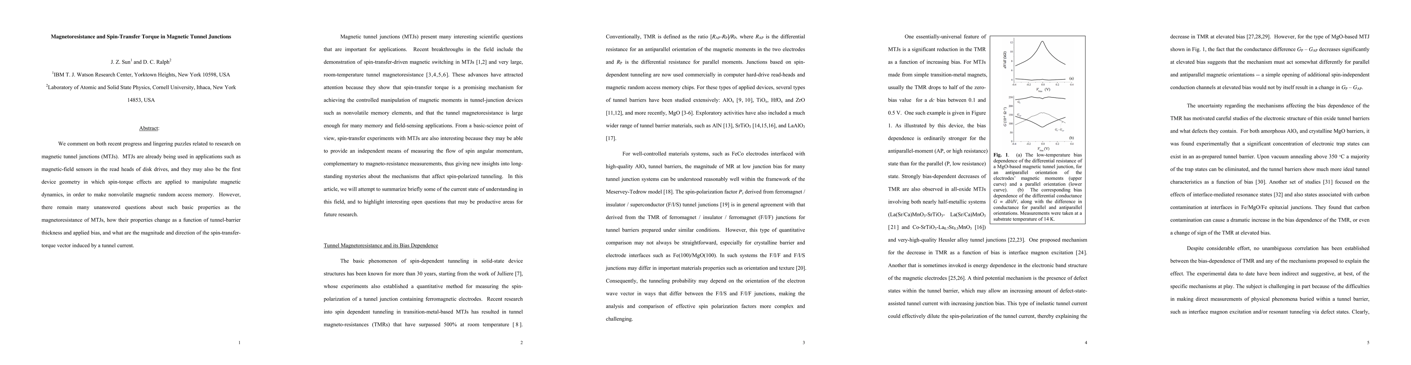 This paper reviews advancements and unresolved issues in magnetic tunnel junctions (MTJs), focusing on their magnetoresistance and spin-transfer torque, while highlighting their applications in magnetic-field sensors and potential for nonvolatile memory technology. Key questions about MTJ properties, including barrier thickness effects and spin-torque direction, remain unanswered.
