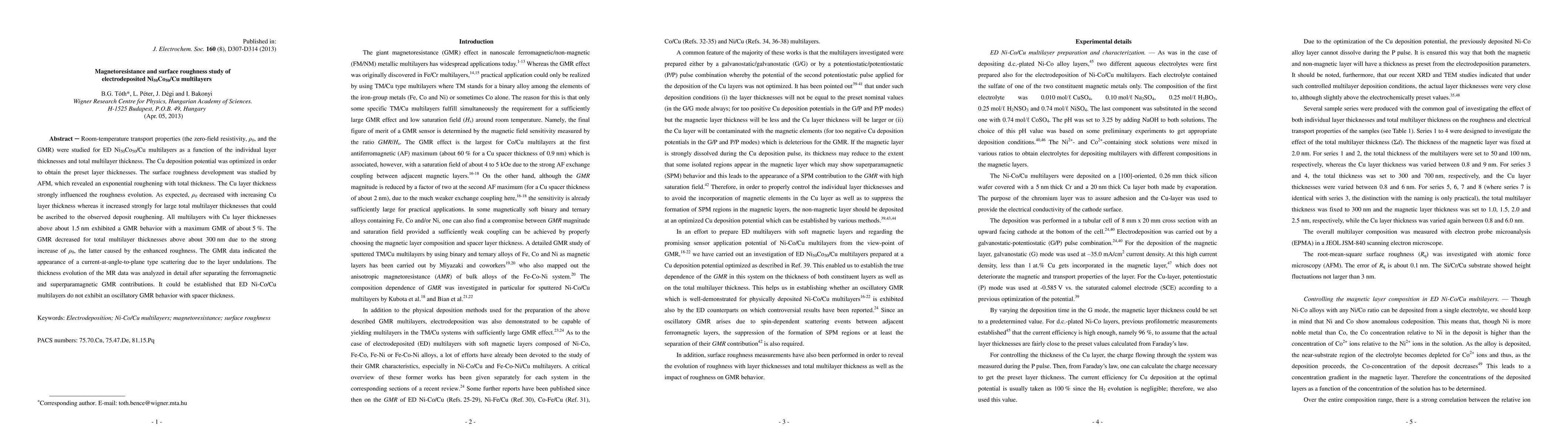 This paper investigates the magnetoresistance and surface roughness of electrodeposited Ni50Co50/Cu multilayers, finding that GMR behavior is present for Cu layer thicknesses above 1.5 nm but diminishes with increased multilayer thickness due to enhanced surface roughness and higher resistivity.