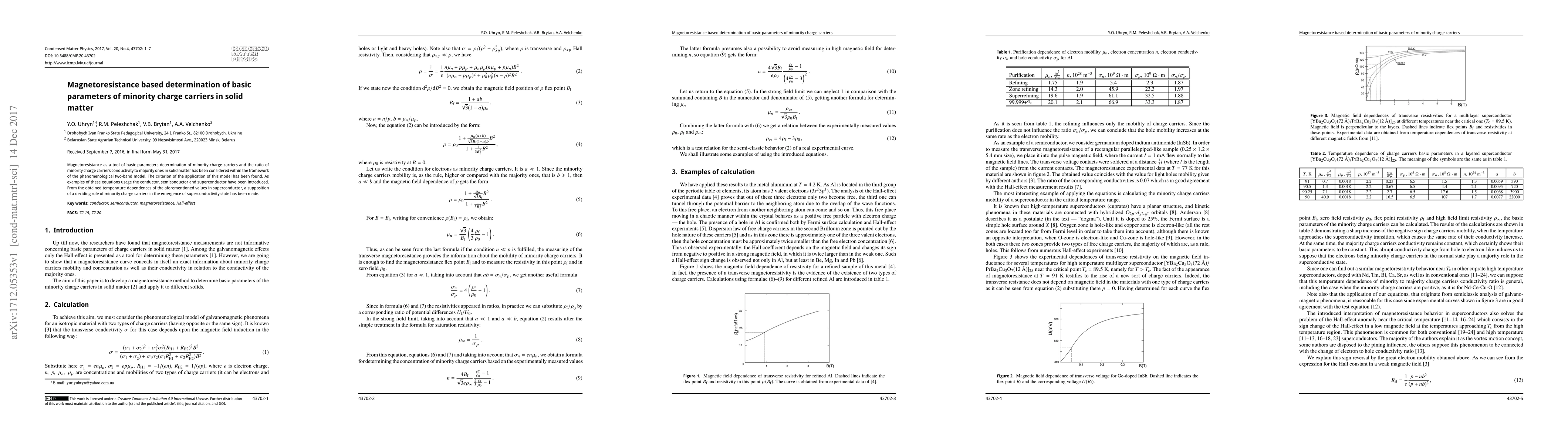 Magnetoresistance as a tool of basic parameters determination of minority charge carriers and the ratio of minority charge carriers conductivity to majority ones in solid matter has been considered within the framework of the phenomenological two-band model. The criterion of the application of this model has been found. As examples of these equations usage the conductor, semiconductor and superconductor have been introduced. From the obtained temperature dependences of the aforementioned values in superconductor, a supposition of a deciding role of minority charge carriers in the emergence of superconductivity state has been made.