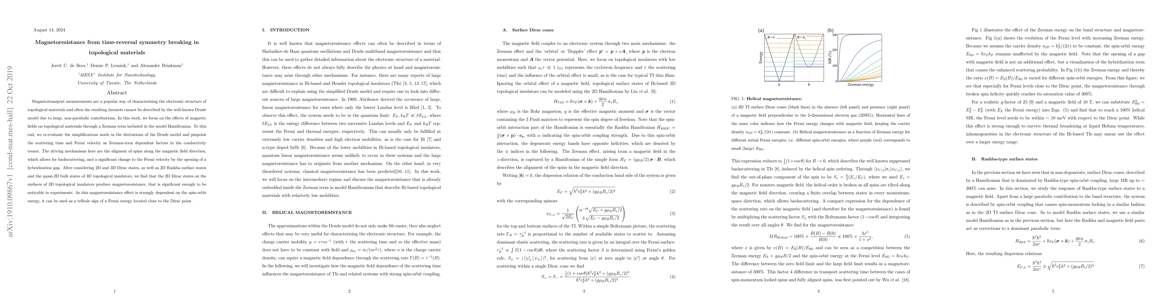 Magnetotransport measurements are a popular way of characterizing the electronic structure of topological materials and often the resulting datasets cannot be described by the well-known Drude model due to large, non-parabolic contributions. In this work, we focus on the effects of magnetic fields on topological materials through a Zeeman term included in the model Hamiltonian. To this end, we re-evaluate the simplifications made in the derivations of the Drude model and pinpoint the scattering time and Fermi velocity as Zeeman-term dependent factors in the conductivity tensor. The driving mechanisms here are the aligment of spins along the magnetic field direction, which allows for backscattering, and a significant change to the Fermi velocity by the opening of a hybridization gap. After considering 2D and 3D Dirac states, as well as 2D Rashba surface states and the quasi-2D bulk states of 3D topological insulators, we find that the 2D Dirac states on the surfaces of 3D topological insulators produce magnetoresistance, that is significant enough to be noticable in experiments. As this magnetoresistance effect is strongly dependent on the spin-orbit energy, it can be used as a telltale sign of a Fermi energy located close to the Dirac point.