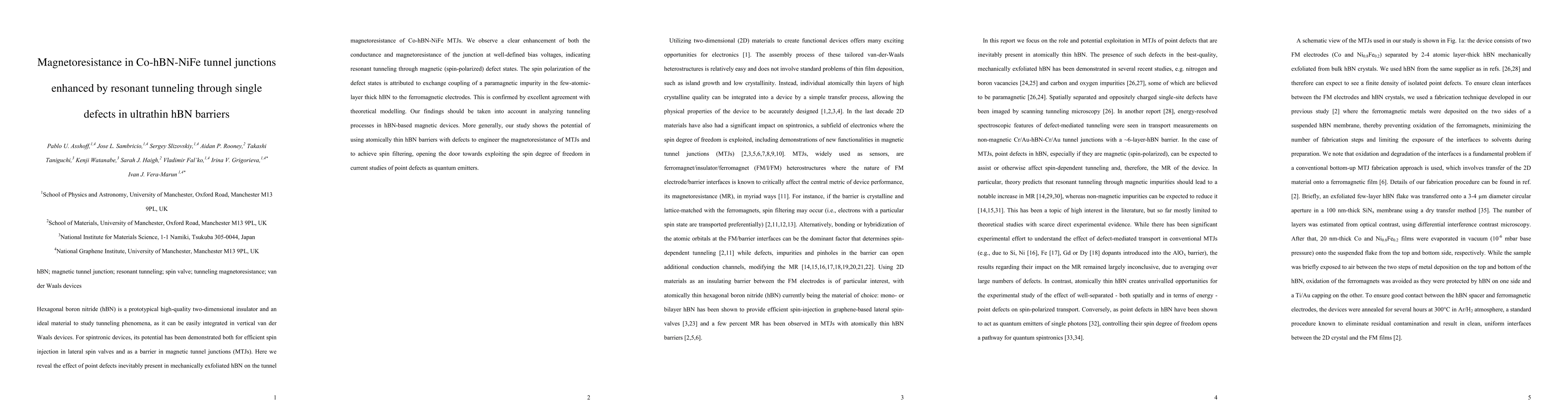 This study investigates the magnetoresistance in Co-hBN-NiFe tunnel junctions, revealing that resonant tunneling through single defects in ultrathin hBN barriers enhances both conductance and magnetoresistance, suggesting spin polarization from exchange coupling with paramagnetic impurities. Theoretical modeling confirms these findings, highlighting the potential of defect-engineered hBN barriers for spintronic applications.