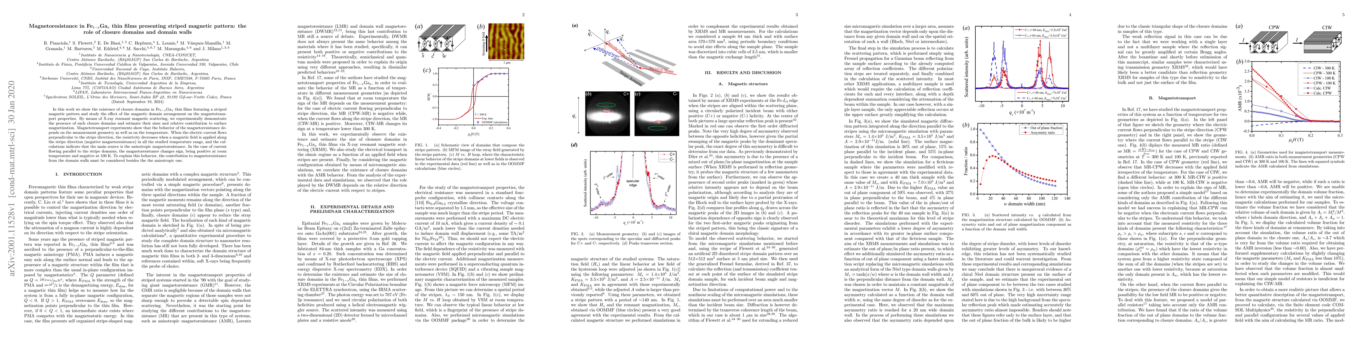 In this work we show the existence of closure domains in Fe$_{1-x}$Ga$_x$ thin films featuring a striped magnetic pattern and study the effect of the magnetic domain arrangement on the magnetotransport properties. By means of X-ray resonant magnetic scattering, we experimentally demonstrate the presence of such closure domains and estimate their sizes and relative contribution to surface magnetization. Magnetotransport experiments show that the behavior of the magnetoresistance depends on the measurement geometry as well as on the temperature. When the electric current ows perpendicular to the stripe direction, the resistivity decreases when a magnetic field is applied along the stripe direction (negative magnetoresistance) in all the studied temperature range, and the calculations indicate that the main source is the anisotropic magnetoresistance. In the case of current flowing parallel to the stripe domains, the magnetoresistance changes sign, being positive at room temperature and negative at 100 K. To explain this behavior, the contribution to magnetoresistance from the domain walls must be considered besides the anisotropic one.