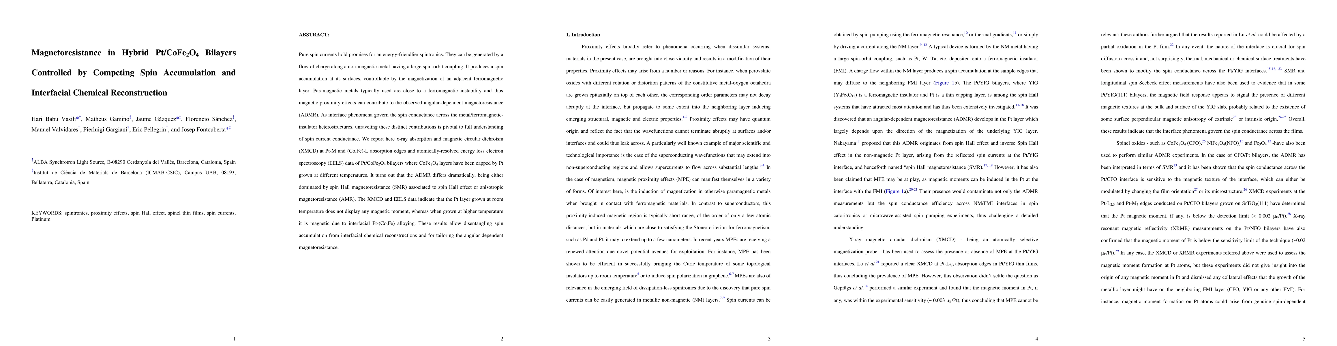 Pure spin currents hold promises for an energy-friendlier spintronics. They can be generated by a flow of charge along a non-magnetic metal having a large spin-orbit coupling. It produces a spin accumulation at its surfaces, controllable by the magnetization of an adjacent ferromagnetic layer. Paramagnetic metals typically used are close to a ferromagnetic instability and thus magnetic proximity effects can contribute to the observed angular-dependent magnetoresistance (ADMR). As interface phenomena govern the spin conductance across the metal/ferromagnetic-insulator heterostructures, unraveling these distinct contributions is pivotal to full understanding of spin current conductance. We report here x-ray absorption and magnetic circular dichroism (XMCD) at Pt-M and (Co,Fe)-L absorption edges and atomically-resolved energy loss electron spectroscopy (EELS) data of Pt/CoFe2O4 bilayers where CoFe2O4 layers have been capped by Pt grown at different temperatures. It turns out that the ADMR differs dramatically, being either dominated by spin Hall magnetoresistance (SMR) associated to spin Hall effect or anisotropic magnetoresistance (AMR). The XMCD and EELS data indicate that the Pt layer grown at room temperature does not display any magnetic moment, whereas when grown at higher temperature it is magnetic due to interfacial Pt-(Co,Fe) alloying. These results allow disentangling spin accumulation from interfacial chemical reconstructions and for tailoring the angular dependent magnetoresistance.