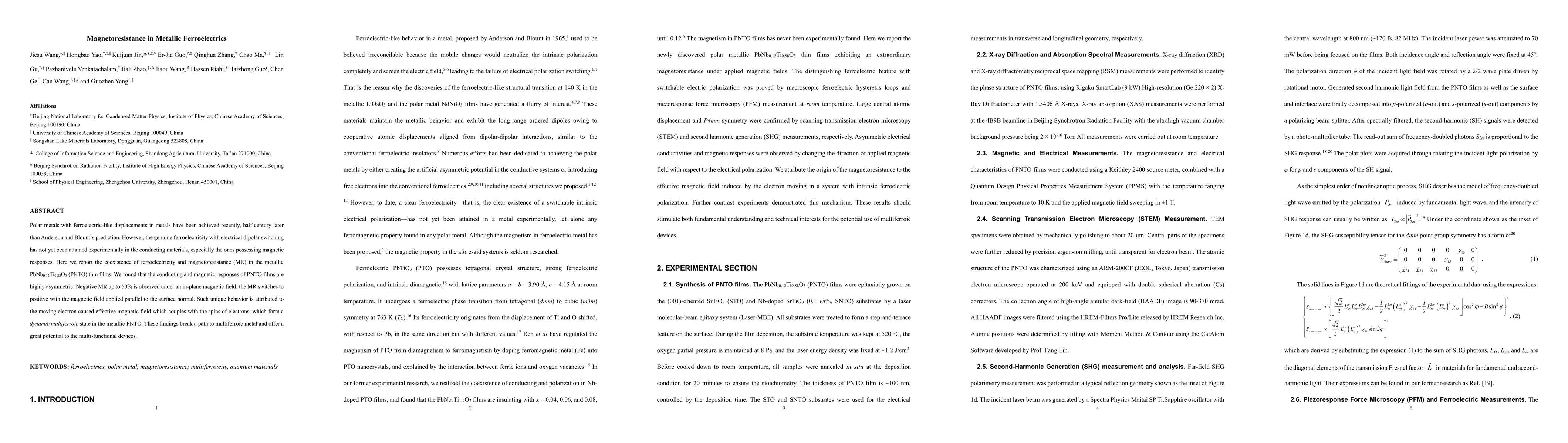 Polar metals with ferroelectric-like displacements in metals have been achieved recently, half century later than Anderson and Blount's prediction. However, the genuine ferroelectricity with electrical dipolar switching has not yet been attained experimentally in the conducting materials, especially the ones possessing magnetic responses. Here we report the coexistence of ferroelectricity and magnetoresistance (MR) in the metallic PbNb0.12Ti0.88O3 (PNTO) thin films. We found that the conducting and magnetic responses of PNTO films are highly asymmetric. Negative MR up to 50% is observed under an in-plane magnetic field; the MR switches to positive with the magnetic field applied parallel to the surface normal. Such unique behavior is attributed to the moving electron caused effective magnetic field which couples with the spins of electrons, which form a dynamic multiferroic state in the metallic PNTO. These findings break a path to multiferroic metal and offer a great potential to the multi-functional devices.