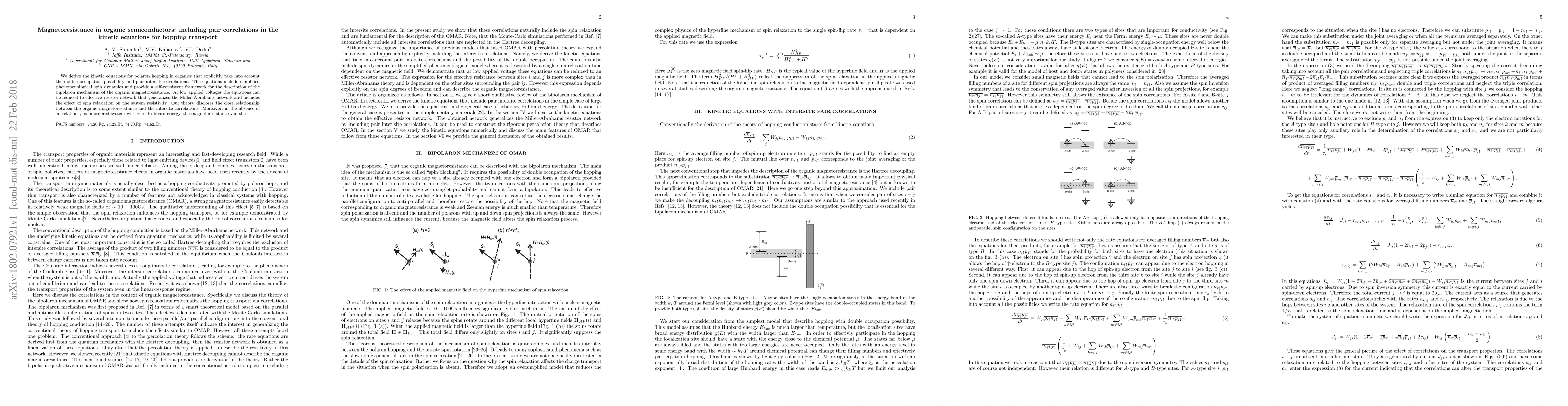 We derive the kinetic equations for polaron hopping in organics that explicitly take into account the double occupation possibility and pair intersite correlations. The equations include simplified phenomenological spin dynamics and provide a self-consistent framework for the description of the bipolaron mechanism of the organic magnetoresistance. At low applied voltages the equations can be reduced to effective resistor network that generalizes the Miller-Abrahams network and includes the effect of spin relaxation on the system resistivity. Our theory discloses the close relationship between the organic magnetoresistance and the intersite correlations. Moreover, in the absence of correlations, as in ordered system with zero Hubbard energy, the magnetoresistance vanishes.