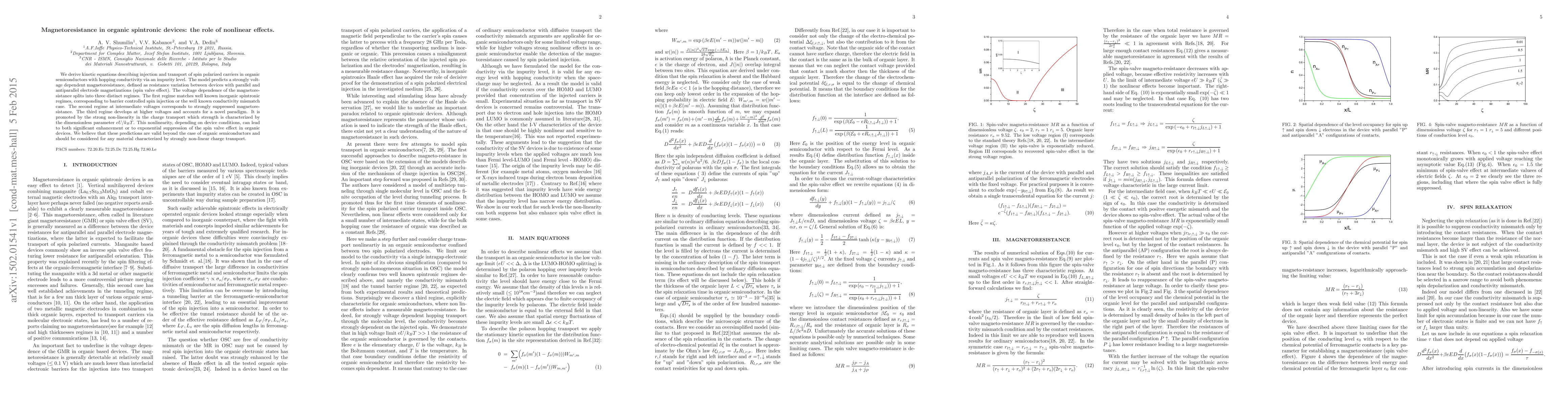 We derive kinetic equations describing injection and transport of spin polarized carriers in organic semiconductors with hopping conductivity via an impurity level. The model predicts a strongly voltage dependent magnetoresistance, defined as resistance variation between devices with parallel and antiparallel electrode magnetizations (spin valve effect). The voltage dependence of the magnetoresistance splits into three distinct regimes. The first regime matches well known inorganic spintronic regimes, corresponding to barrier controlled spin injection or the well known conductivity mismatch case. The second regime at intermediate voltages corresponds to strongly suppressed magnetoresistance. The third regime develops at higher voltages and accounts for a novel paradigm. It is promoted by the strong non-linearity in the charge transport which strength is characterized by the dimensionless parameter $eU/k_BT$. This nonlinearity, depending on device conditions, can lead to both significant enhancement or to exponential suppression of the spin valve effect in organic devices. We believe that these predictions are valid beyond the case of organic semiconductors and should be considered for any material characterized by strongly non-linear charge transport.