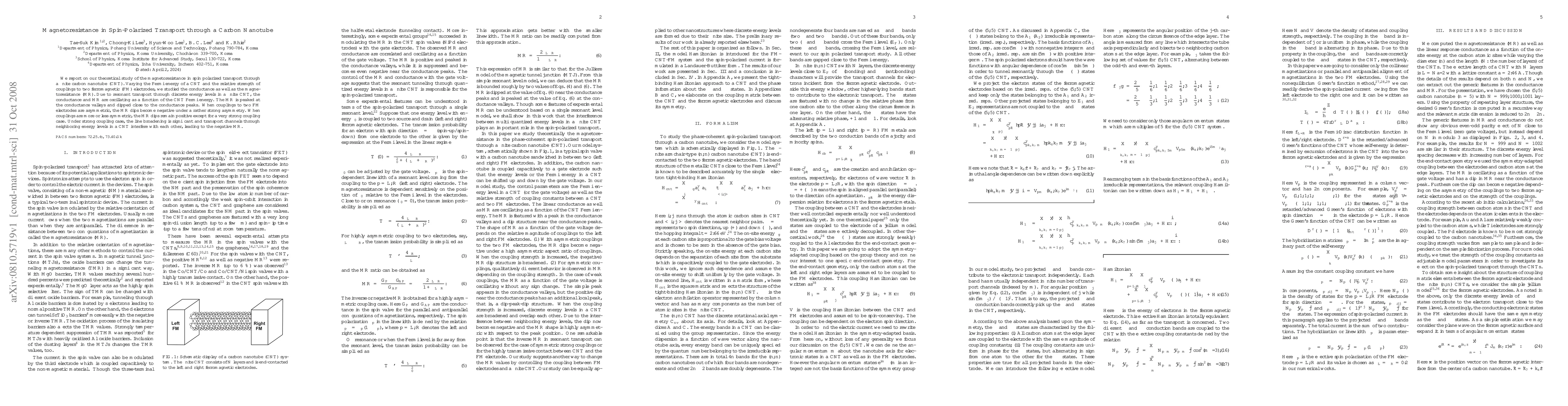 This research explores magnetoresistance in spin-polarized transport through a carbon nanotube, finding oscillations in conductance and magnetoresistance linked to the Fermi energy. Under asymmetric couplings to ferromagnetic electrodes, negative magnetoresistance occurs, while symmetric couplings generally result in positive dips unless strong coupling causes interference among transport channels.