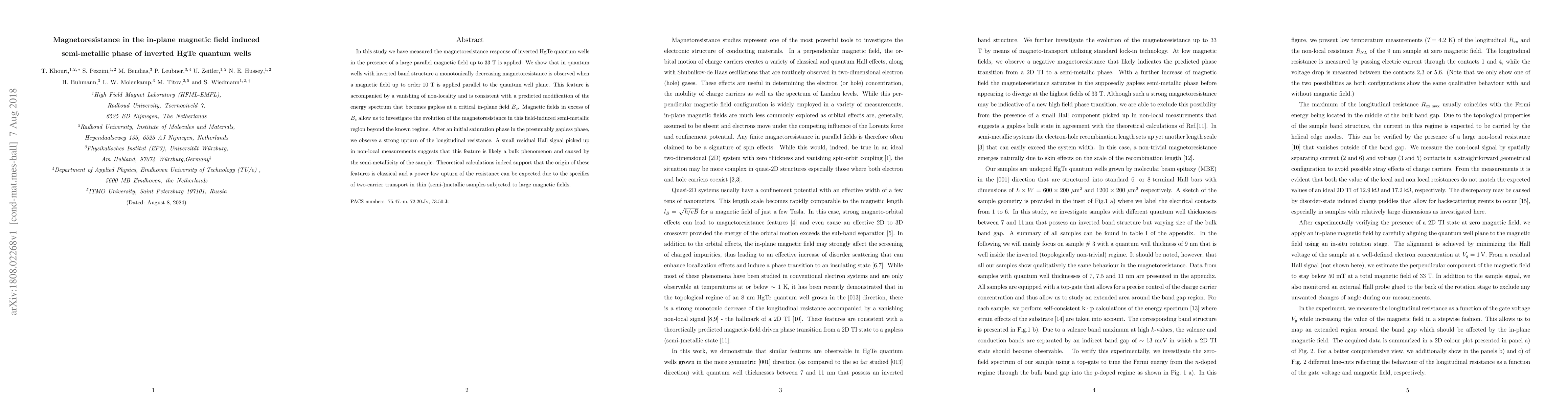 This study investigates the magnetoresistance of inverted HgTe quantum wells under large parallel magnetic fields, revealing a monotonic decrease up to 10 T, followed by a strong upturn in resistance beyond a critical field, indicating a transition to a semi-metallic phase. The observed behavior is supported by theoretical calculations attributing the upturn to two-carrier transport in thin semi-metallic samples.