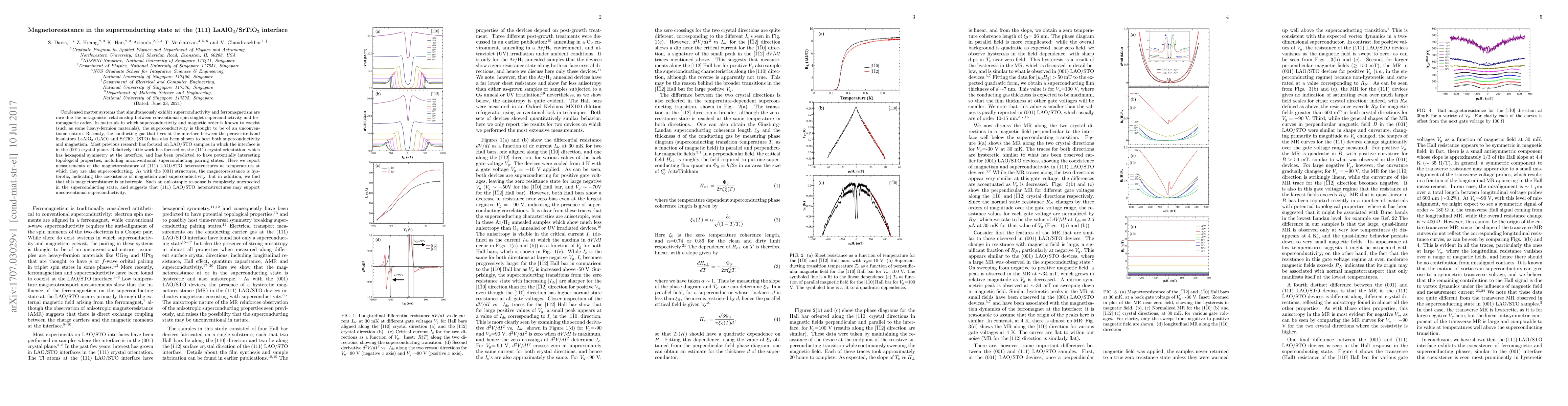 This paper investigates the magnetoresistance in superconducting (111) LaAlO$_3$/SrTiO$_3$ interfaces, revealing an unexpected anisotropic response that suggests the presence of unconventional superconducting pairing states. The findings indicate that these heterostructures may host magnetism and superconductivity in a manner distinct from conventional superconductors.