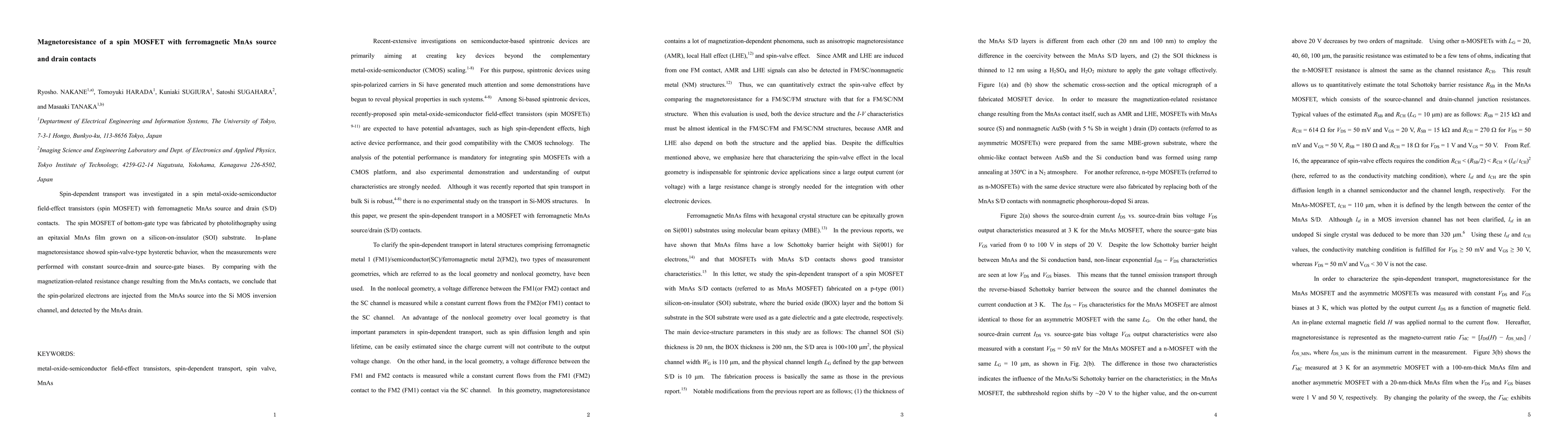 This paper investigates spin-dependent transport in a spin MOSFET with ferromagnetic MnAs source and drain contacts, demonstrating in-plane magnetoresistance with spin-valve-type hysteretic behavior. The study concludes that spin-polarized electrons are injected from the MnAs source and detected by the MnAs drain in the Si MOS inversion channel.