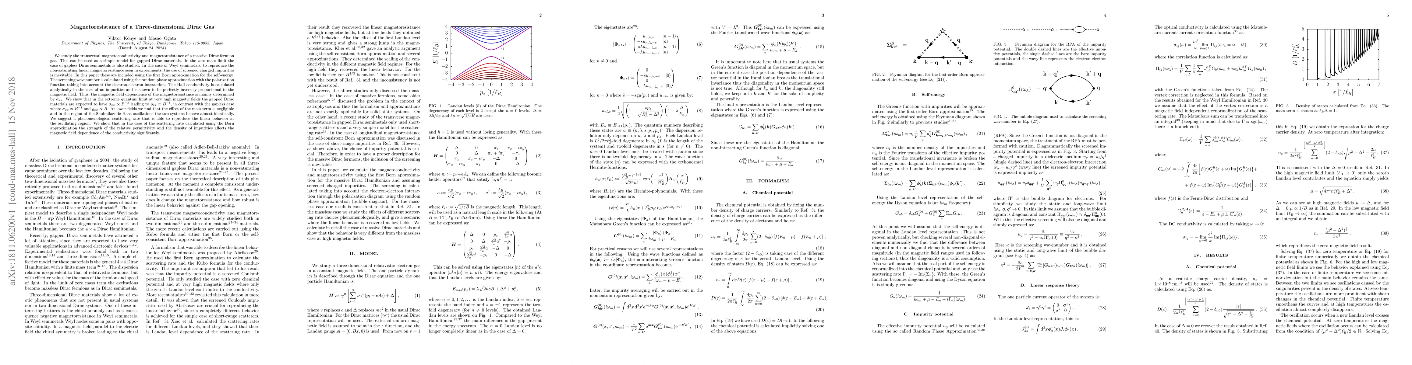 This paper investigates the magnetoresistance of a three-dimensional Dirac gas, focusing on both gapped and gapless Dirac materials. It finds that in the quantum limit, gapped materials exhibit a $\sigma_{xx}\propto B^{-3}$ relationship, while gapless materials show $\sigma_{xx}\propto B^{-1}$, leading to distinct magnetoresistance behaviors.