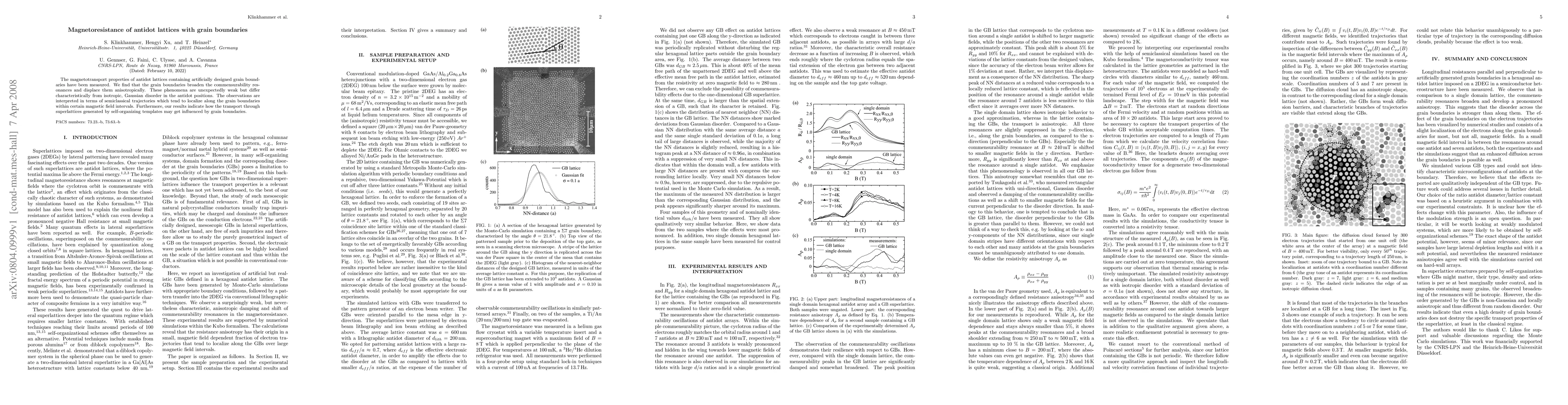 This study investigates the magnetotransport properties of antidot lattices with grain boundaries, revealing that grain boundaries broaden and anisotropically displace commensurability resonances. The findings suggest that semiclassical trajectories localize along grain boundaries, influencing transport in self-organizing superlattices.