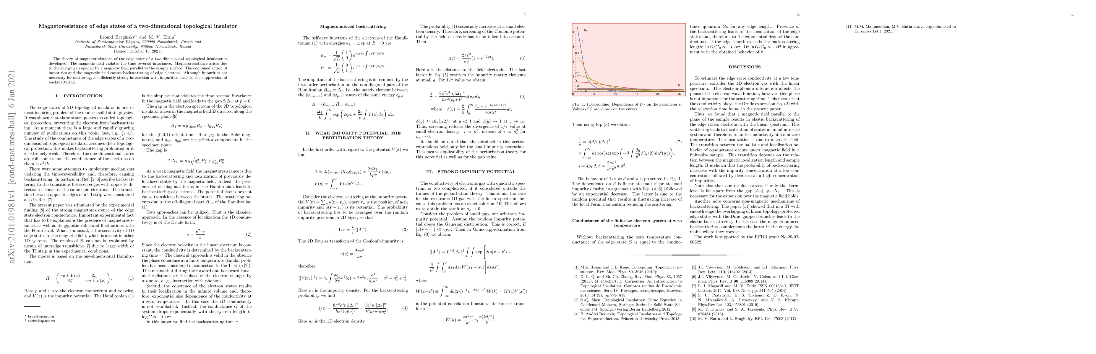 This paper develops a theory for the magnetoresistance of edge states in two-dimensional topological insulators, showing that a magnetic field parallel to the surface opens an energy gap, leading to backscattering of edge electrons due to impurities. Strong impurity interactions can suppress this backscattering.