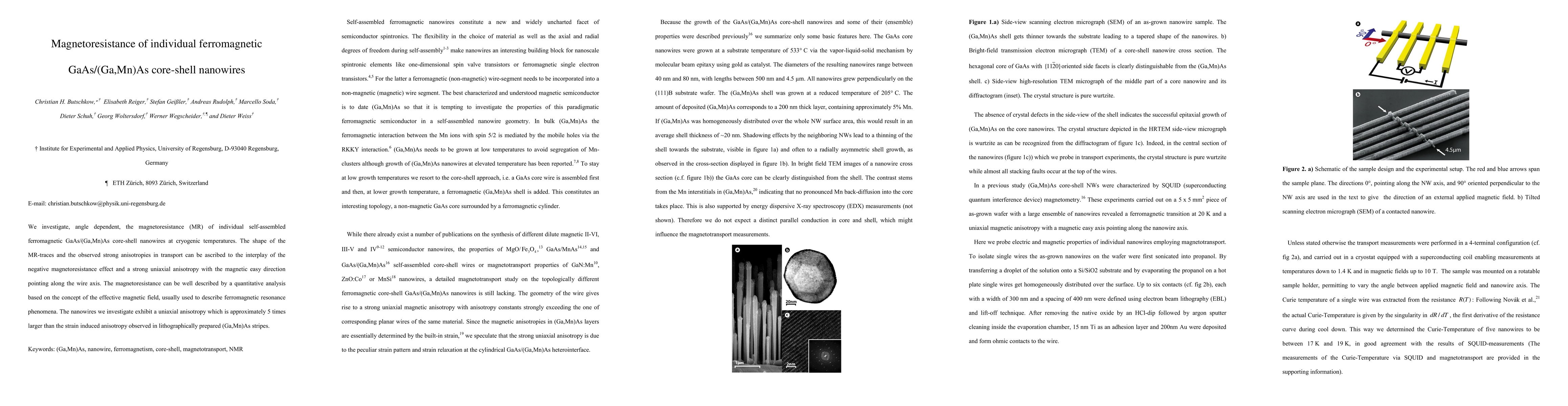 The research investigates the angle-dependent magnetoresistance (MR) of individual self-assembled ferromagnetic GaAs/(Ga,Mn)As core-shell nanowires at cryogenic temperatures using a 2-terminal configuration.